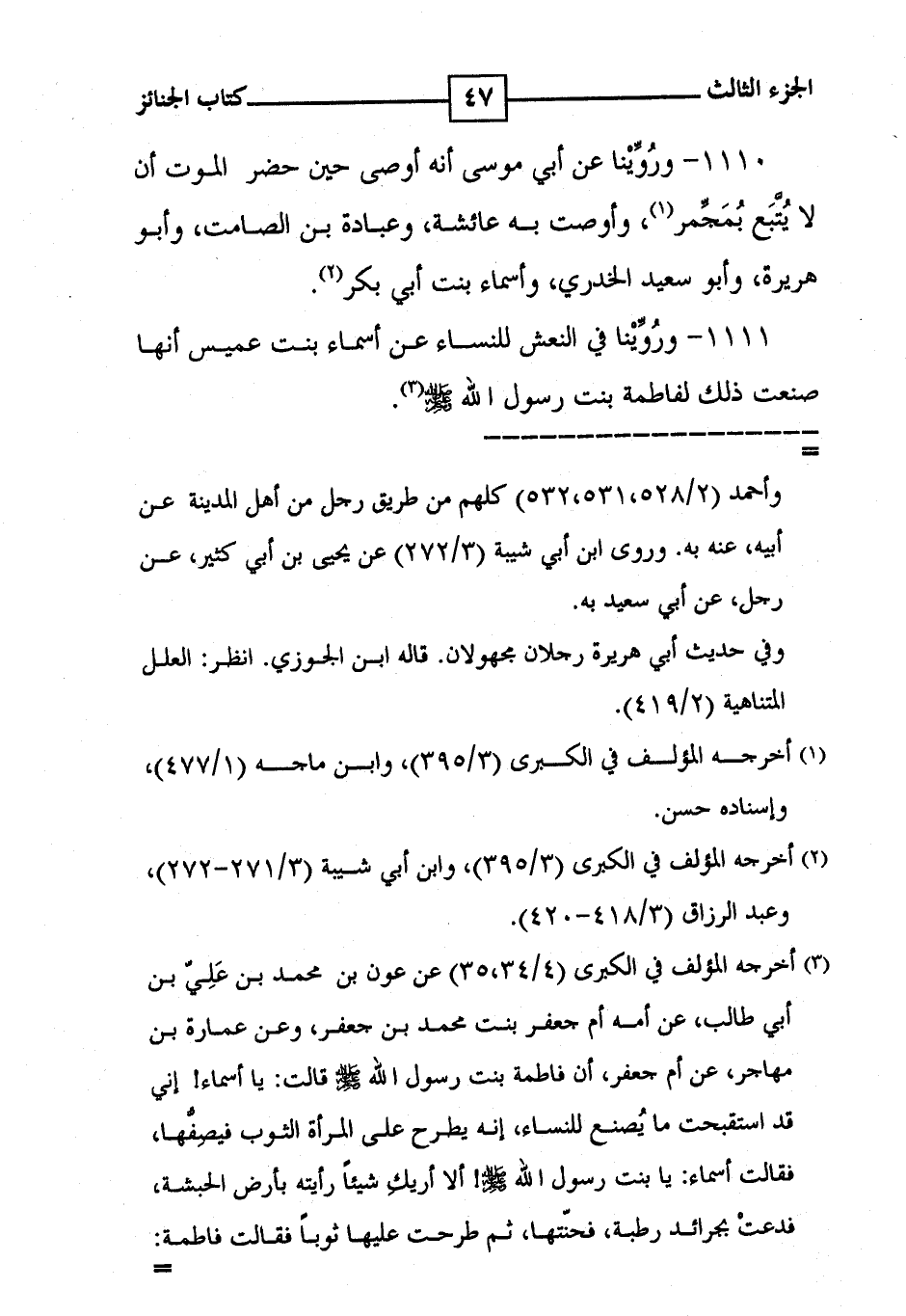 1110 - ورُوِّيْنا عن أبي موسى أنه أوصى حين حضر الموت أن لا يُتَّبَع بُمَجِّمر ( 1 ) ، وأوصت به عائشة ، وعبادة بن الصامت ، وأبو هريرة ، وأبو سعيد الخدري ، وأسماء بنت أبي بكر ( 2 ) .