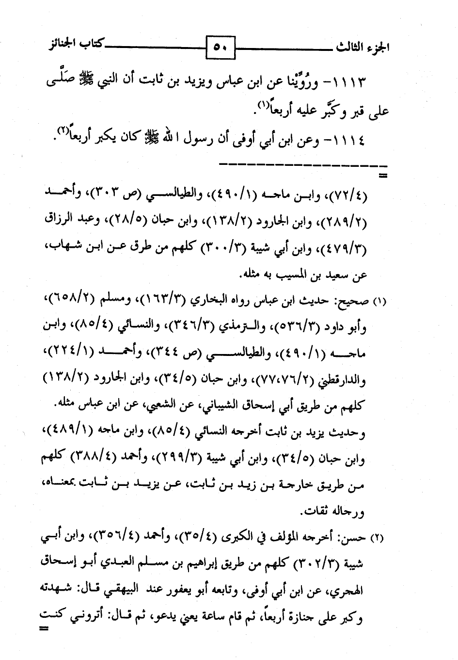 1113 - ورُوِّيْنا عن ابن عباس ويزيد بن ثابت أن النبي [ صلى الله عليه وسلم ] صَلَّى على قبر وكَبَّر عليه أربعاً ( 1 ) .