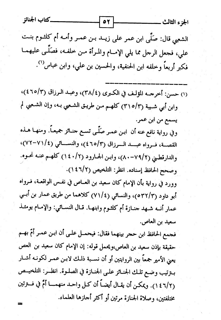الشعبي قال : صَلّى ابن عمر على زيد بن عمر وأمه أم كلثوم بنت علي ، فجعل الرجل مما يلي الإمام والمرأة من خلفه ، فصَلَّى عليهما فكبر أربعاً وخلفه ابن الحنفية ، والحسين بن علي ، وابن عباس ( 1 ) .