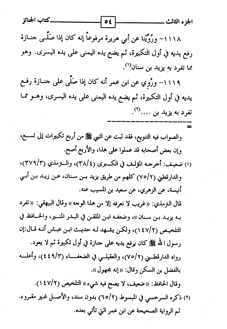 1118 - ورُوِّيْنا عن أبي هريرة مرفوعاً إنه كان إذا صَلَّى جنازة رفع يديه في أول التكبيرة ، ثم يضع يده اليمنى على يده اليسرى ، وهو مما تفرد به يزيد بن سنان ( 1 ) .