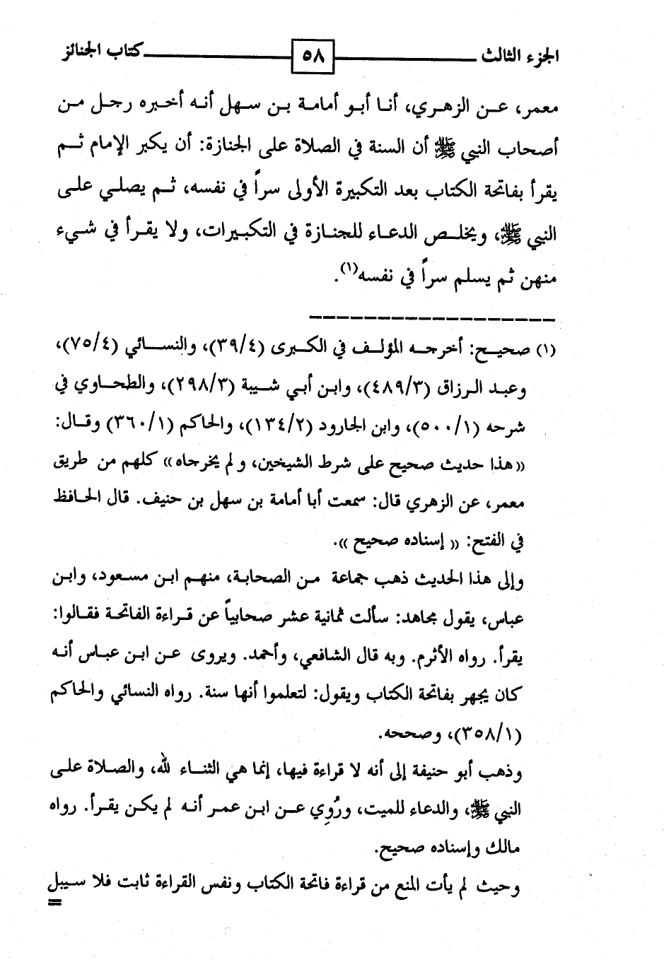 معمر ، عن الزهري ، أنا أبو أمامة بن سهل أنه أخبره رجل من أصحاب النبي [ صلى الله عليه وسلم ] أن السنة في الصلاة على الجنازة : أن يكبر الإمام ثم يقرأ بفاتحة الكتاب بعد التكبيرة الأولى سراً في نفسه ، ثم يصلي على النبي [ صلى الله عليه وسلم ] ، ويخلص الدعاء للجنازة في التكبيرات ، ولا يقرأ في شيء منهن ثم يسلم سراً في نفسه ( 1 ) .
