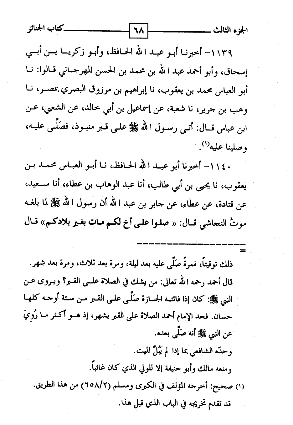 1139 - أخبرنا أبو عبد الله الحافظ ، وأبو زكريا بن أبي إسحاق ، وأبو أحمد عبد الله بن محمد بن الحسن المهرجاني قالوا : نا أبو العباس محمد بن يعقوب ، نا إبراهيم بن مرزوق البصري بمصر ، نا وهب بن جرير ، نا شعبة ، عن إسماعيل بن أبي خالد ، عن الشعبي ، عن ابن عباس قال : أتى رسول الله [ صلى الله عليه وسلم ] على قبر منبوذ ، فصَلَّى عليه ، وصلينا عليه ( 1 ) .