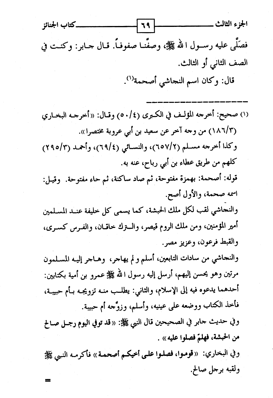 فصَلَّى عليه رسول الله [ صلى الله عليه وسلم ] ، وصفَّنا صفوفاً . قال جابر : وكنت في الصف الثاني أو الثالث . قال : وكان اسم النجاشي أصحمة ( 1 ) .