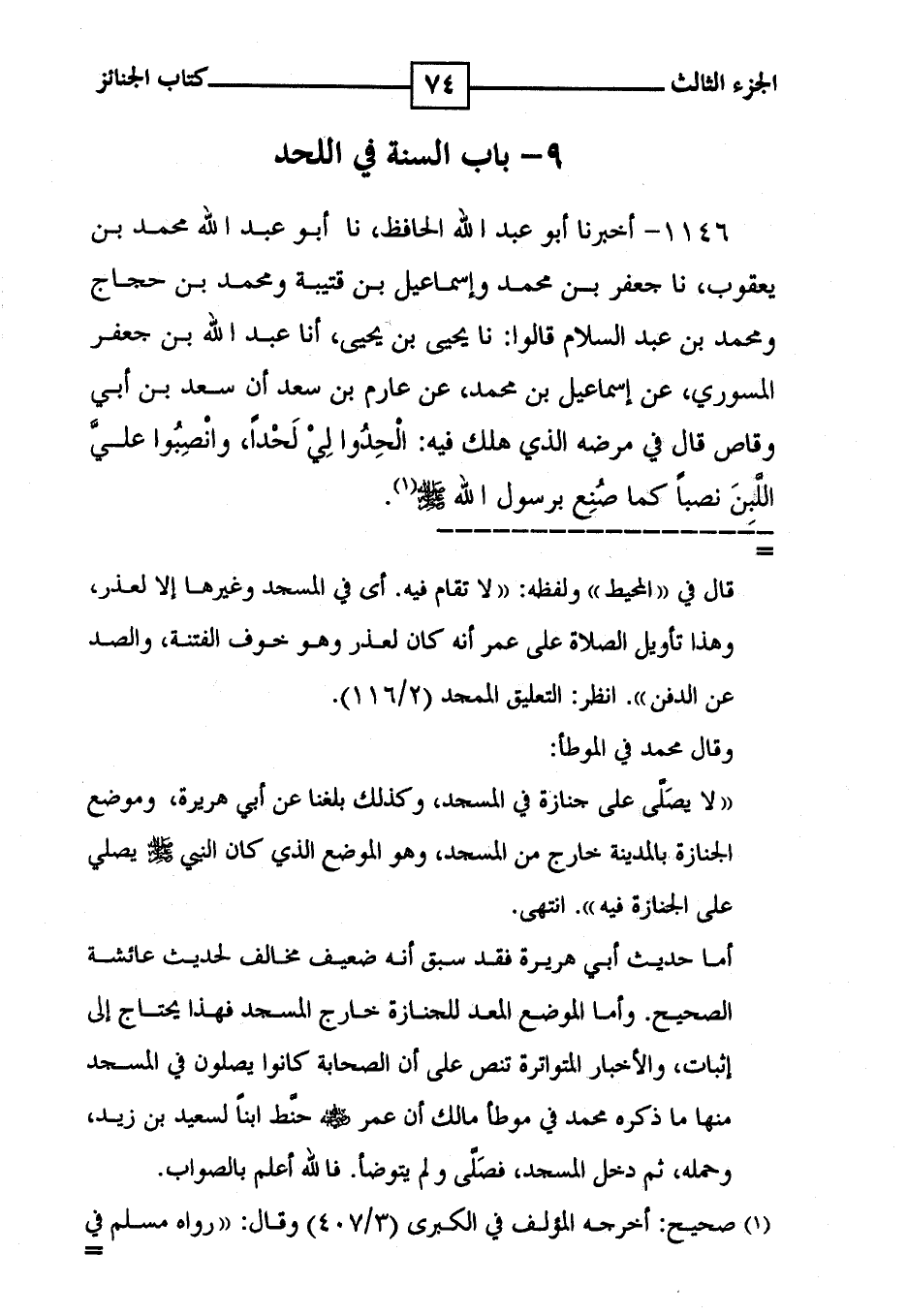1146 - أخبرنا أبو عبد الله الحافظ ، نا أبو عبد الله محمد بن يعقوب ، نا جعفر بن محمد وإسماعيل بن قتيبة ومحمد بن حجاج ومحمد بن عبد السلام قالوا : نا يحيى بن يحيى ، أنا عبد الله بن جعفر المسوري ، عن إسماعيل بن محمد ، عن عارم بن سعد أن سعد بن أبي وقاص قال في مرضه الذي هلك فيه : الْحِدُوا لِيْ لَحْداً ، وانْصِبُوا عليَّ اللَّبِنَ نصباً كما صُنِع برسول الله [ صلى الله عليه وسلم ] ( 1 ) .