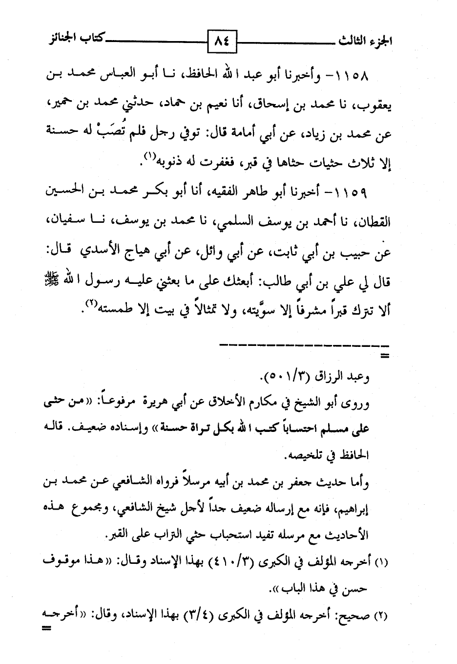 1158 - وأخبرنا أبو عبد الله الحافظ ، نا أبو العباس محمد بن يعقوب ، نا محمد بن إسحاق ، أنا نعيم بن حماد ، حدثني محمد بن حمير ، عن محمد بن زياد ، عن أبي أمامة قال : توفي رجل فلم تُصَبْ له حسنة إلا ثلاث حثيات حثاها في قبر ، فغفرت له ذنوبه ( 1 ) .