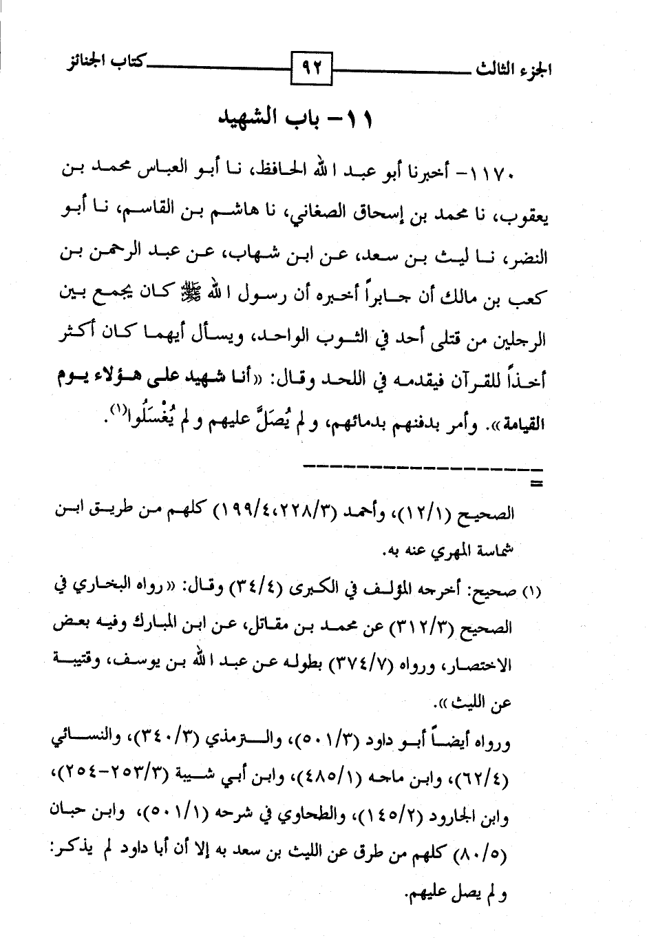 1170 - أخبرنا أبو عبد الله الحافظ ، نا أبو العباس محمد بن يعقوب ، نا محمد بن إسحاق الصغاني ، نا هاشم بن القاسم ، نا أبو النضر ، نا ليث بن سعد ، عن ابن شهاب ، عن عبد الرحمن بن كعب بن مالك أن جابراً أخبره أن رسول الله [ صلى الله عليه وسلم ] كان يجمع بين الرجلين من قتلى أحد في الثوب الواحد ، ويسأل أيهما كان أكثر أخذاً للقرآن فيقدمه في اللحد وقال : ' أنا شهيد على هؤلاء يوم القيامة ' . وأمر بدفنهم بدمائهم ، ولم يُصَلَّ عليهم ولم يُغْسَلُوا ( 1 ) .