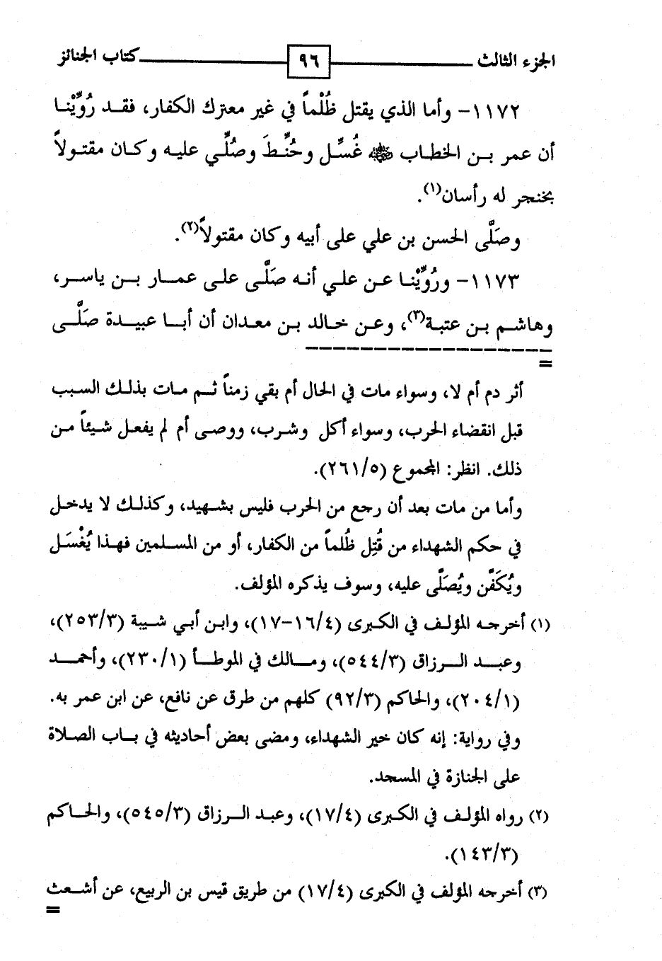 1172 - وأما الذي يقتل ظُلماً في غير معترك الكفار ، فقد رُوِّينا أن عمر بن الخطاب رضي الله عنه غُسِّل وحُنِّطَ وصُلِّي عليه وكان مقتولاً بخنجر له رأسان ( 1 ) . وصَلَّى الحسن بن علي على أبيه وكان مقتولاً ( 2 ) .