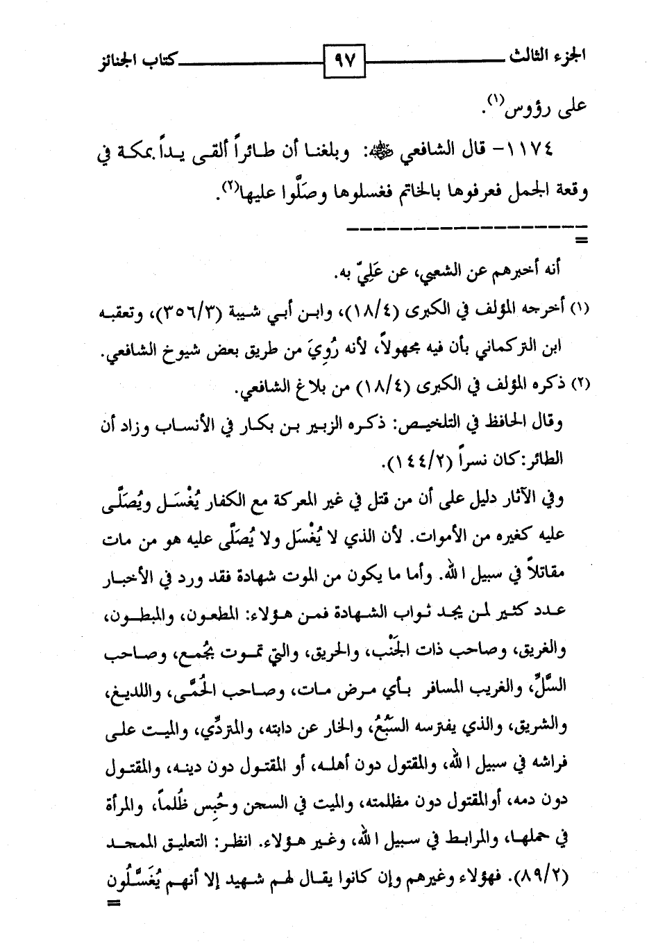 1174 - قال الشافعي ( رضي الله عنه ) : وبلغنا أن طائراً ألقى يداً بمكة في وقعة الجمل فعرفوها بالخاتم فغسلوها وصَلَّوا عليها ( 2 ) .