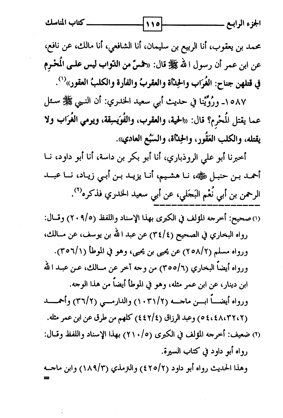 محمد بن يعقوب ، أنا الربيع بن سليمان ، أنا الشافعي ، أنا مالك ، عن نافع ، عن ابن عمر أن رسول الله صلى الله عليه وسلم قال : ' خمسٌ من الدّواب ليس على المُحْرِم في قتلهن جناح : الغُرَاب والحِدْأة والعقربُ والفأرة والكلبُ العقور ' ( 1 ) .