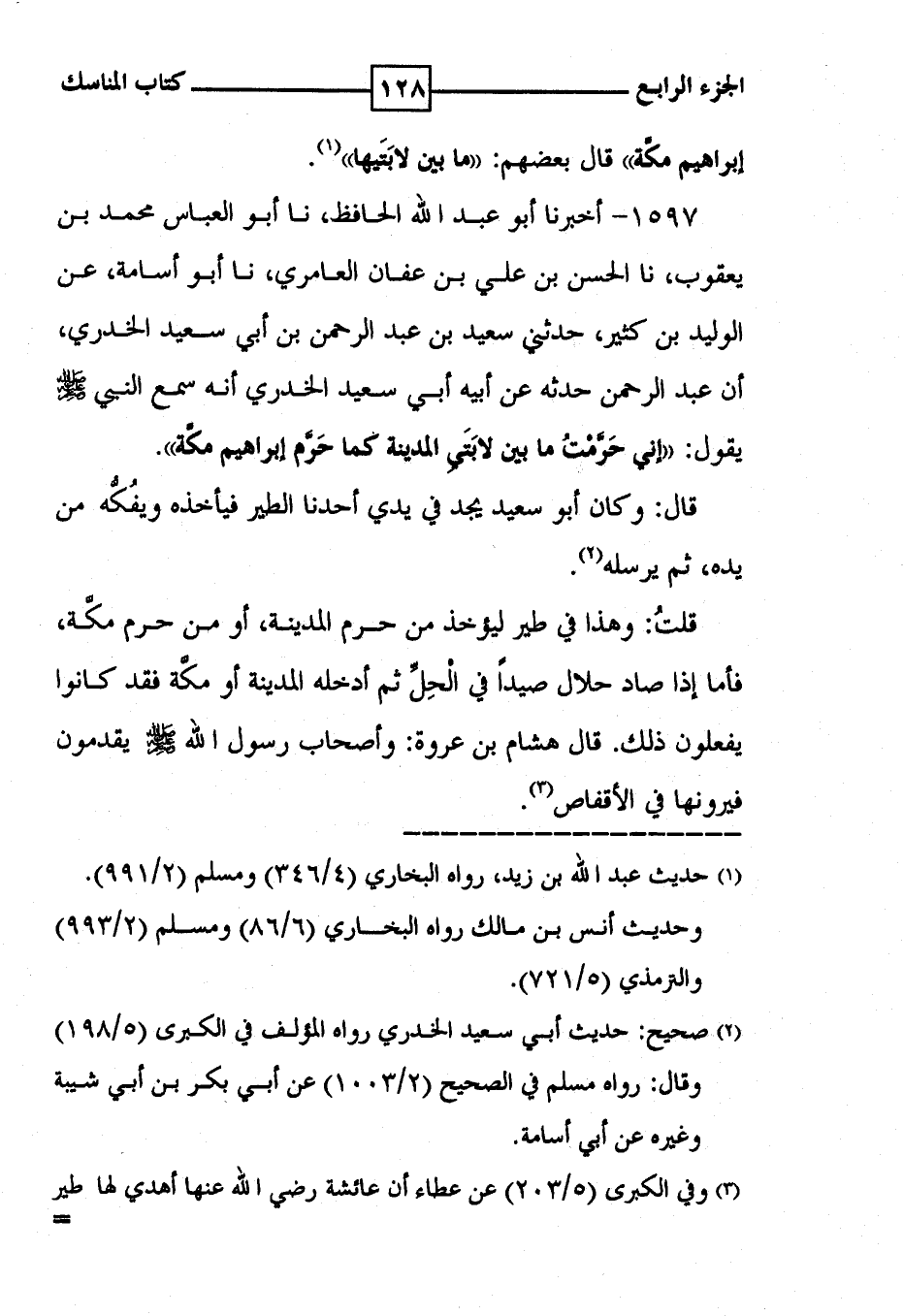 1597 - أخبرنا أبو عبد الله الحافظ ، نا أبو العباس محمد بن يعقوب ، نا الحسن بن علي بن عفان العامري ، نا أبو أسامة ، عن الوليد بن كثير ، حدثني سعيد بن عبد الرحمن بن أبي سعيد الخدري ، أن عبد الرحمن حدثه عن أبيه أبي سعيد الخدري أنه سمع النبي صلى الله عليه وسلم يقول : ' إني حَرَّمْتُ ما بين لابَتَيِ المدينة كما حَرَّم إبراهيم مكَّة ' . قال : وكان أبو سعيد يجد في يدي أحدنا الطير فيأخذه ويفُكُّه من يده ، ثم يرسله ( 2 ) . قلت : وهذا في طير ليؤخذ من حرم المدينة ، أو من حرم مكّة ، فأما إذا صاد حلال صيداً في الْحِلِّ ثم أدخله المدينة أو مكَّة فقد كانوا يفعلون ذلك . قال هشام بن عروة : وأصحاب رسول الله صلى الله عليه وسلم يقدمون فيرونها في الأقفاص ( 3 ) .
