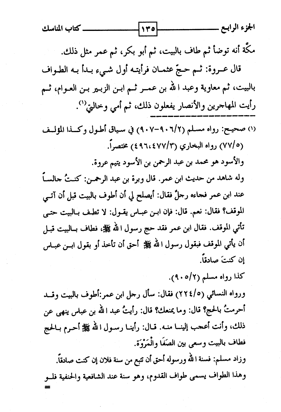 مكَّة أنه توضأ ثم طاف بالبيت ، ثم أبو بكر ، ثم عمر مثل ذلك . قال عروة : ثم حجّ عثمان فرأيته أول شيء بدأ به الطواف بالبيت ، ثم معاوية وعبد الله بن عمر ثم ابن الزبير بن العوام ، ثم رأيت المهاجرين والأنصار يفعلون ذلك ، ثم أمي وخالتي ( 1 ) .