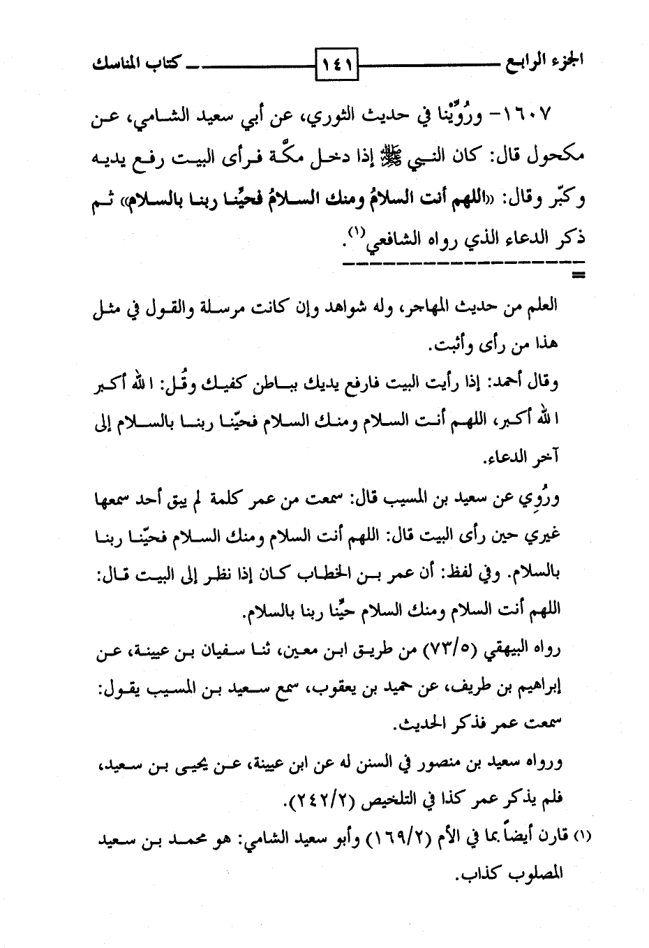 1607 - ورُوِّيْنا في حديث الثوري ، عن أبي سعيد الشامي ، عن مكحول قال : كان النبي صلى الله عليه وسلم إذا دخل مكَّة فرأى البيت رفع يديه وكبّر وقال : ' اللهم أنت السلامُ ومنك السلامُ فحيِّنا ربنا بالسلام ' ثم ذكر الدعاء الذي رواه الشافعي ( 1 ) .