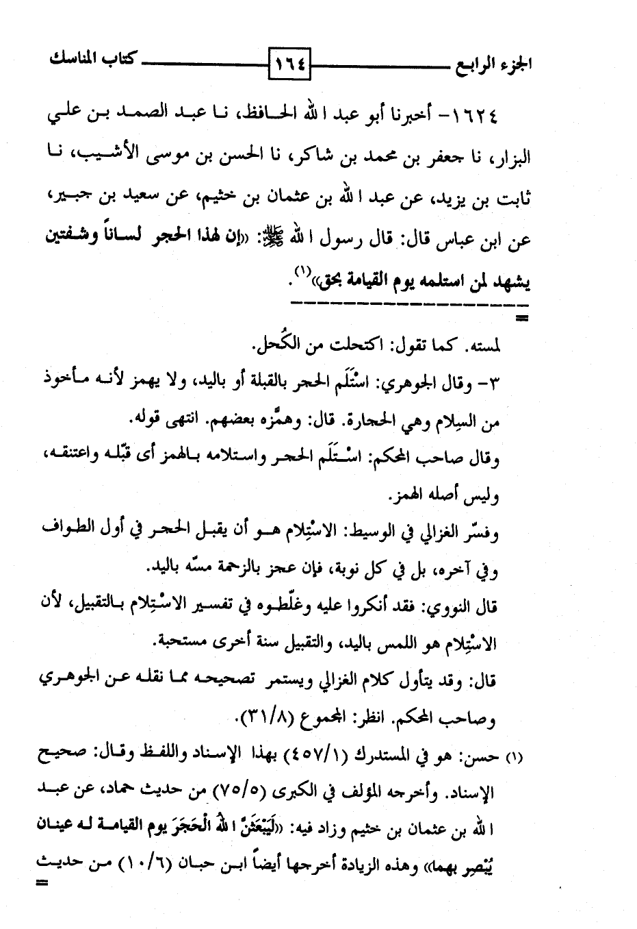 1624 - أخبرنا أبو عبد الله الحافظ ، نا عبد الصمد بن علي البزار ، نا جعفر بن محمد بن شاكر ، نا الحسن بن موسى الأشيب ، نا ثابت بن يزيد ، عن عبد الله بن عثمان بن خثيم ، عن سعيد بن جبير ، عن ابن عباس قال : قال رسول الله صلى الله عليه وسلم : ' إن لهذا الحجر لساناً وشفتين يشهد لمن استلمه يوم القيامة بحق ' ( 1 ) .