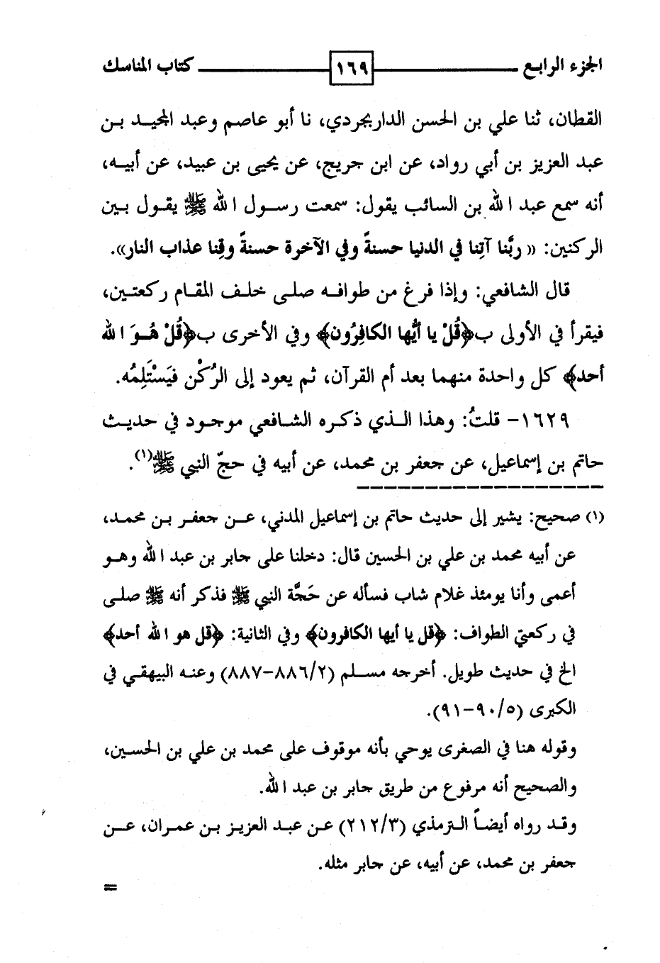 القطان ، ثنا علي بن الحسن الداربجردي ، نا أبو عاصم وعبد المجيد بن عبد العزيز بن أبي رواد ، عن ابن جريج ، عن يحيى بن عبيد ، عن أبيه ، أنه سمع عبد الله بن السائب يقول : سمعت رسول الله يقول بين الركنين : ' ربَّنا آتِنا في الدنيا حسنةً وفي الآخرة حسنةً وقِنا عذاب النار ' . قال الشافعي : وإذا فرغ من طوافه صلى خلف المقام ركعتين ، فيقرأ في الأولى ب ! ( قل يا أيها الكافرون ) ! وفي الأخرى ب ! ( قل هو الله أحد ) ! كل واحدة منهما بعد أم القرآن ، ثم يعود إلى الرُكْن فيَسْتَلِمُه .