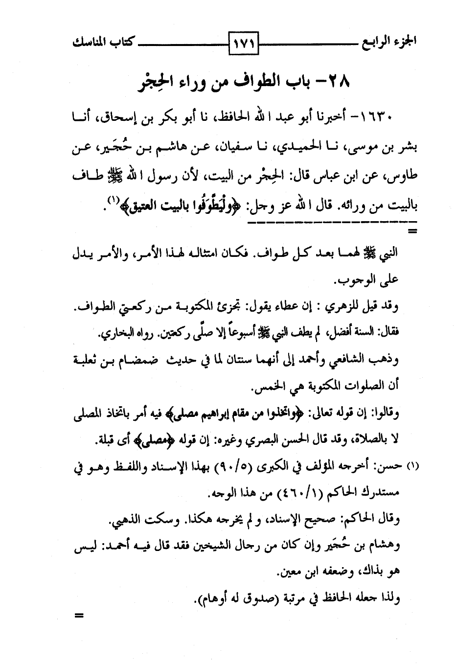 1630 - أخبرنا أبو عبد الله الحافظ ، نا أبو بكر بن إسحاق ، أنا بشر بن موسى ، نا الحميدي ، نا سفيان ، عن هاشم بن حُجَير ، عن طاوس ، عن ابن عباس قال : الحِجْر من البيت ، لأن رسول الله صلى الله عليه وسلم طاف بالبيت من وارئه . قال الله عز وجل : ! ( وليطوفوا بالبيت العتيق ) ! ( 1 ) .