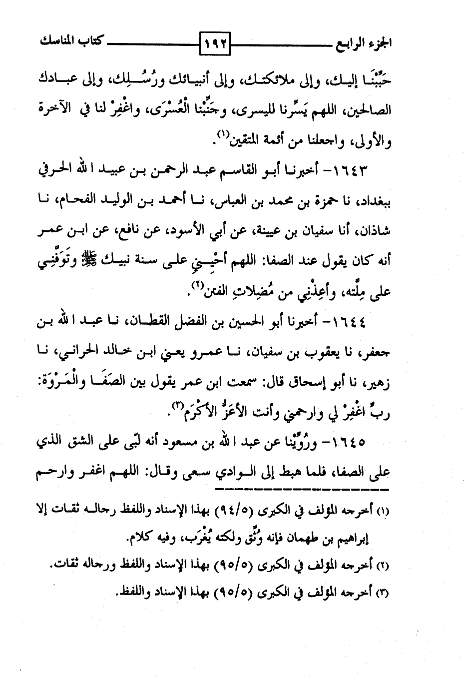 1644 - أخبرنا أبو الحسين بن الفضل القطان ، نا عبد الله بن جعفر ، نا يعقوب بن سفيان ، نا عمرو يعني ابن خالد الحراني ، نا زهير ، نا أبو إسحاق قال : سمعت ابن عمر يقول بين الصَفَا والْمَرْوَة : ربِّ اغْفِرْ لي وارحمني وأنت الأعَزُّ الأكْرَم ( 3 ) .