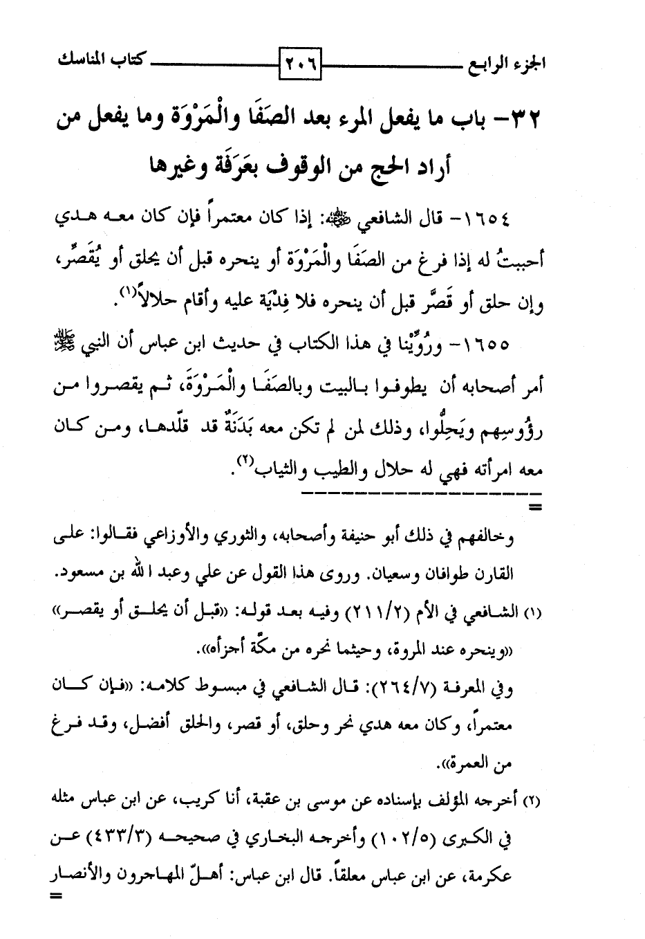 1655 - ورُوِّيْنا في هذا الكتاب في حديث ابن عباس أن النبي صلى الله عليه وسلم أمر أصحابه أن يطوفوا بالبيت وبالصَفَا والْمَرْوَة ، ثم يقصروا من رؤُوسِهم ويَحِلُّوا ، وذلك لمن لم تكن معه بَدَنَةٌ قد قلّدها ، ومن كان معه امرأته فهي له حلال والطيب والثياب ( 2 ) .