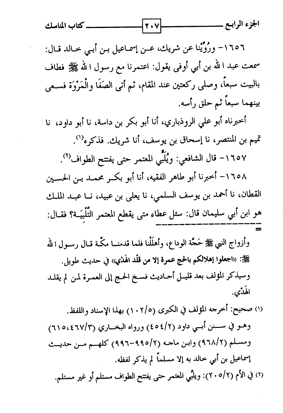 1656 - ورُوِّيْنا عن شريك ، عن إسماعيل بن أبي خالد قال : سمعت عبد الله بن أبي أوفى يقول : اعتمرنا مع رسول الله صلى الله عليه وسلم فطاف بالبيت سبعاً ، وصلى ركعتين عند المقام ، ثم أتى الصَفَا والْمَرْوَة فسعى بينهما سبعاً ثم حلق رأسه . أخبرناه أبو علي الروذباري ، أنا أبو بكر بن داسة ، نا أبو داود ، نا تميم بن المنتصر ، نا إسحاق بن يوسف ، أنا شريك . فذكره ( 1 ) .