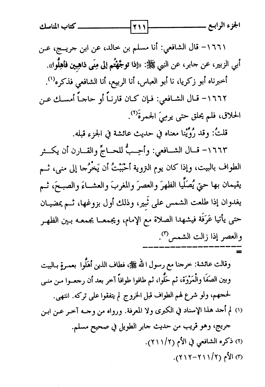 1662 - قال الشافعي : فإن كان قارناً أو حاجاً أمسك عن الحلاق ، فلم يحلق حتى يرمِيَ الجَمرةَ ( 2 ) . قلت : وقد رُوِّيْنا معناه في حديث عائشة في الجزء قبله .