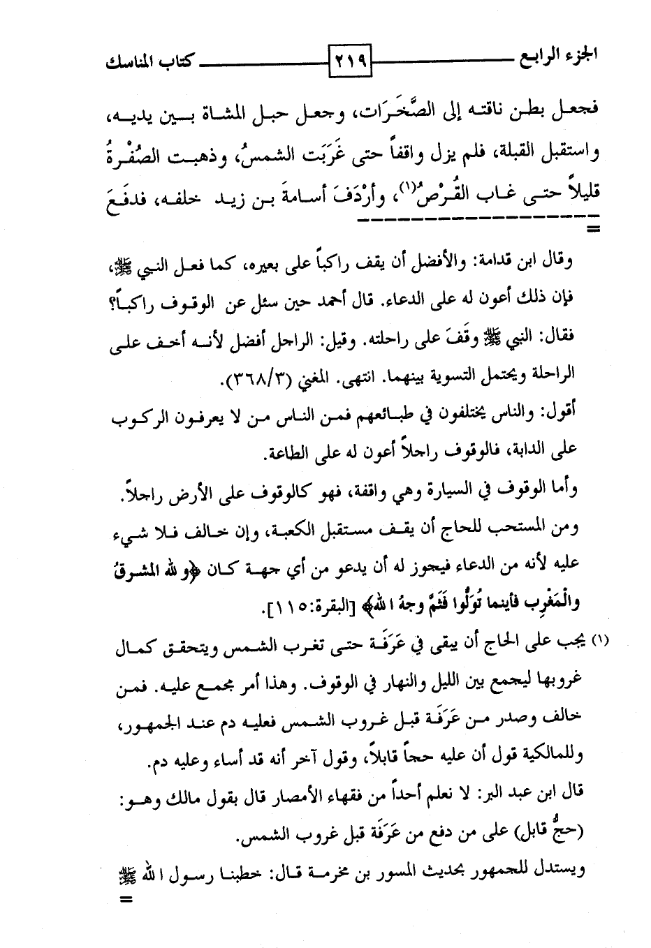 فجعل بطن ناقته إلى الصَّخَرَات ، وجعل حبل المشاة بين يديه ، واستقبل القبلة ، فلم يزل واقفاً حتى غَرَبَت الشمسُ ، وذهبت الصُفْرةُ قليلاً حتى غاب القُرْصُ ( 1 ) ، وأرْدَفَ أسامةَ بن زيد خلفه ، فدفَعَ
