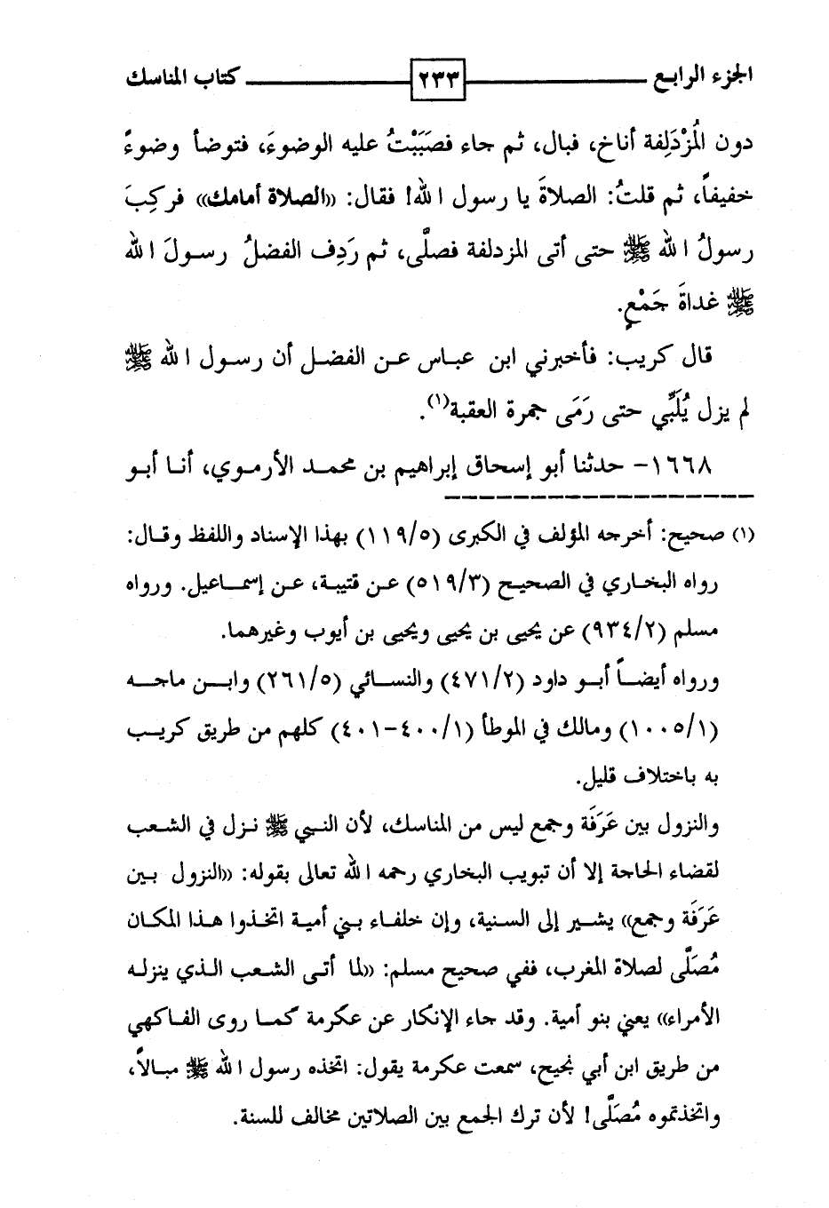 دون المُزْدَلِفة أناخ ، فبال ، ثم جاء فصَبَبْتُ عليه الوضوءَ ، فتوضأ وضوءً خفيفاً ، ثم قلتُ : الصلاةَ يا رسول الله ! فقال : ' الصلاة أمامك ' فركِبَ رسولُ الله حتى أتى المزدلفة فصلَّى ، ثم رَدِف الفضلُ رسولَ الله غداةَ جَمْعٍ . قال كريب : فأخبرني ابن عباس عن الفضل أن رسول الله لم يزل يُلَبِّي حتى رَمَى جمرة العقبة ( 1 ) .