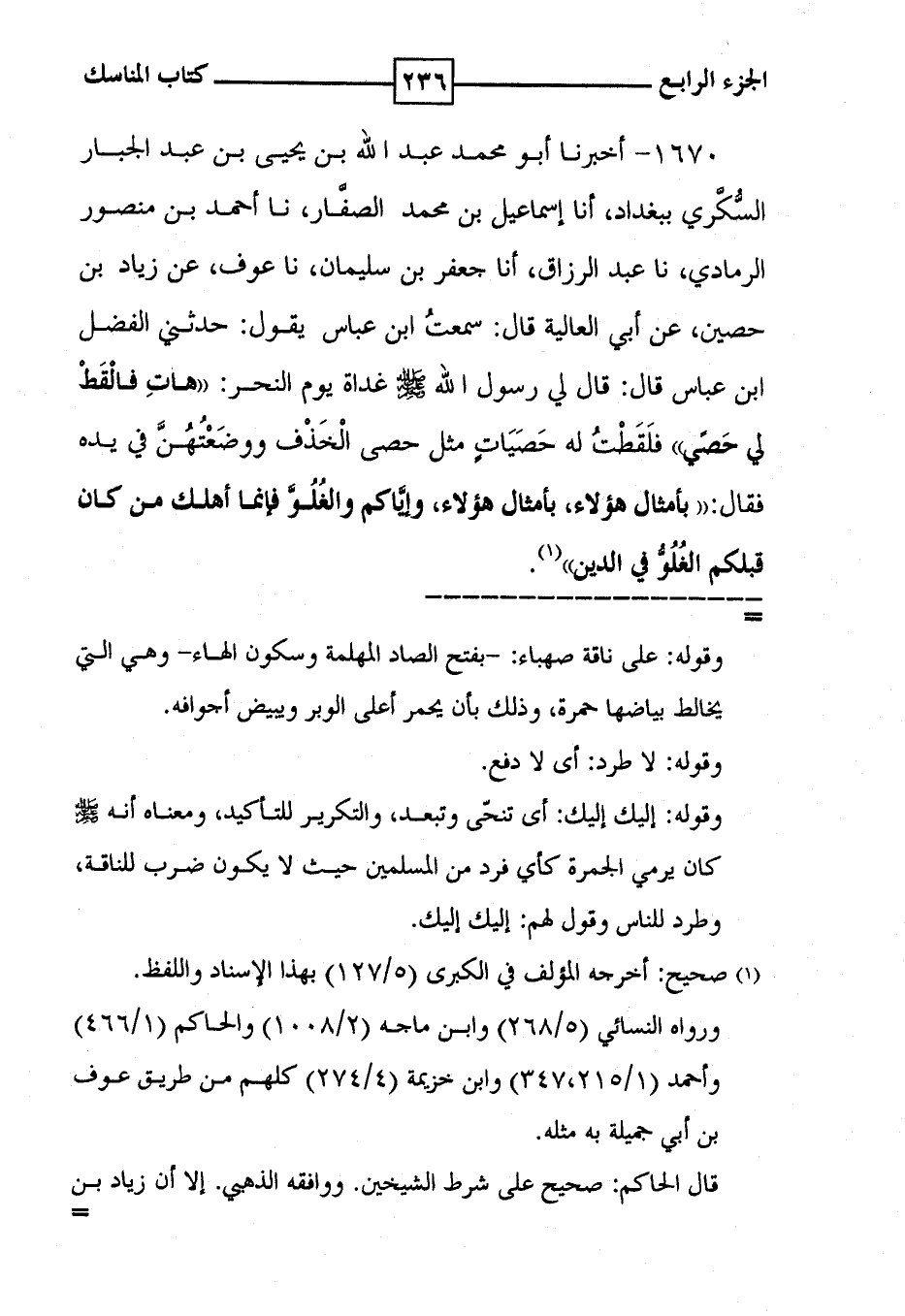 1670 - أخبرنا أبو محمد عبد الله بن يحيى بن عبد الجبار السُّكَّري ببغداد ، أنا إسماعيل بن محمد الصفَّار ، نا أحمد بن منصور الرمادي ، نا عبد الرزاق ، أنا جعفر بن سليمان ، نا عوف ، عن زياد بن حصين ، عن أبي العالية قال : سمعتُ ابن عباس يقول : حدثني الفضل ابن عباس قال : قال لي رسول الله غداة يوم النحر : ' هاتِ فالْقَطْ لي حَصًي ' فلَقَطْتُ له حَصَيَاتٍ مثل حصى الْخَذْف ووضَعْتُهُنَّ في يده فقال : ' بأمثال هؤلاء ، بأمثال هؤلاء ، وإيَّأكم والغُلُوَّ فإنما أهلك من كان قبلكم الغُلُوُّ في الدين ' ( 1 ) .