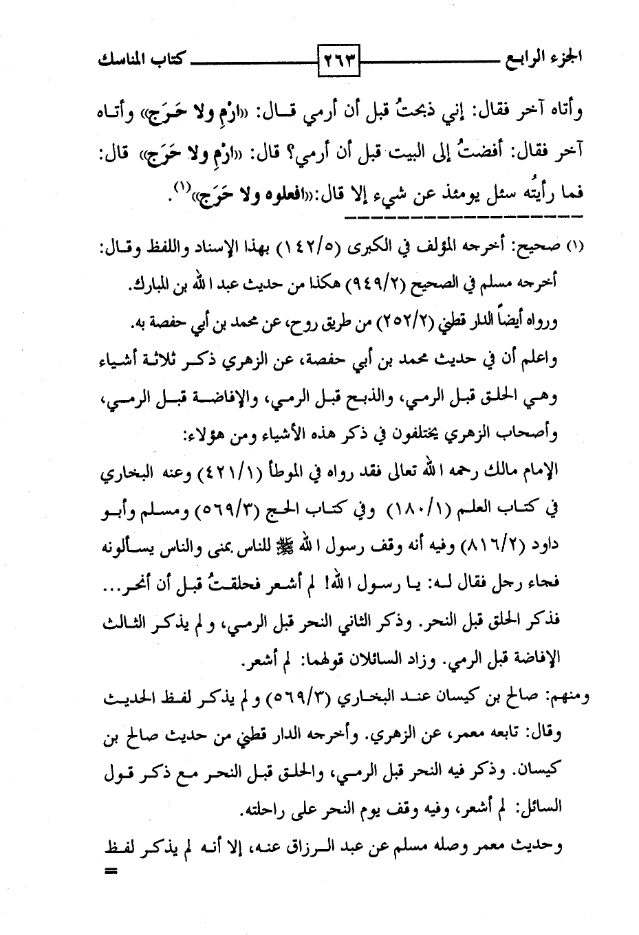 وأتاه آخر فقال إني ذبحتُ قبل أن أرمي قال : ' ارْمِ ولا حَرَج ' وأتاه آخر فقال : أفضتُ إلى البيت قبل أن أرمي ؟ قال : ' ارْمِ ولا حَرَج ' قال : فما رأيْتُه سئل يومئذ عن شيء إلا قال : ' افعلوه ولا حَرَج ' ( 1 ) .