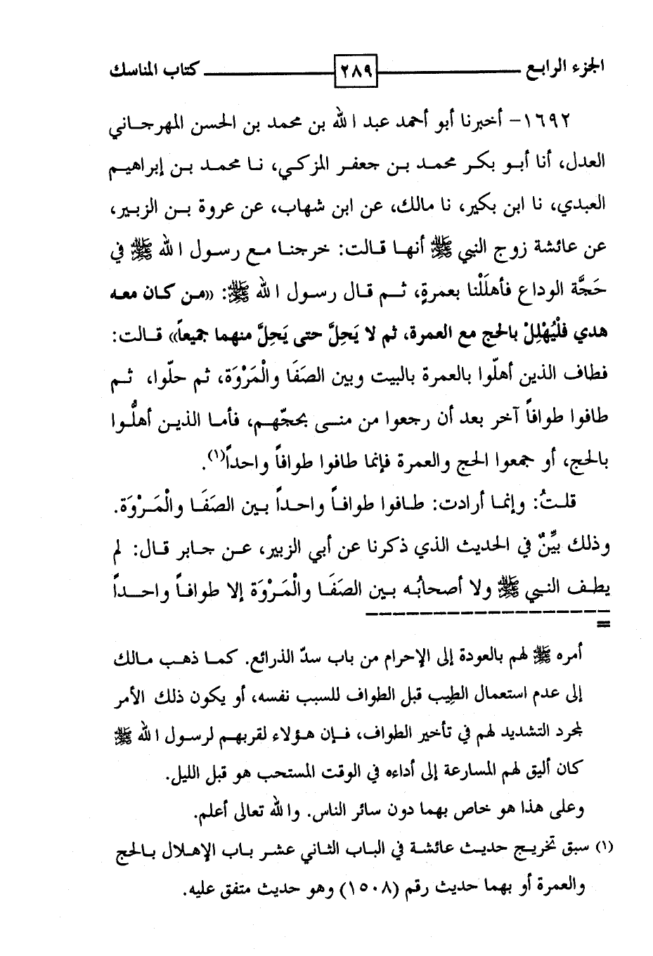 1692 - أخبرنا أبو أحمد عبد الله بن محمد بن الحسن المهرجاني العدل ، أنا أبو بكر محمد بن جعفر المزكي ، نا محمد بن إبراهيم العبدي ، نا ابن بكير ، نا مالك ، عن ابن شهاب ، عن عروة بن الزبير ، عن عائشة زوج النبي أنها قالت : خرجنا مع رسول الله في حَجَّة الوداع فأهلَلْنا بعمرةٍ ، ثم قال رسول الله : ' من كان معه هدي فلْيُهْلِلْ بالحج مع العمرة ، ثم لا يَحِلَّ حتى يَحِلَّ منهما جميعاً ' . قالت : فطاف الذين أهلّوا بالعمرة بالبيت وبين الصَفَا والْمَرْوَة ، ثم حلّوا ، ثم طافوا طوافاً آخر بعد أن رجعوا من منى بحجّهم ، فأما الذين أهلُّوا بالحج ، أو جمعوا الحج والعمرة فإنما طافوا طوافاً واحداً ( 1 ) . قلتُ : وإنما أرادت : طافوا طوافاً واحداً بين الصَفَا والْمَرْوَة . وذلك بيِّنٌ في الحديث الذي ذكرنا عن أبي الزبير ، عن جابر قال : لم يطف النبي ولا أصحابُه بين الصَفَا والْمَرْوَة إلا طوافاً واحداً
