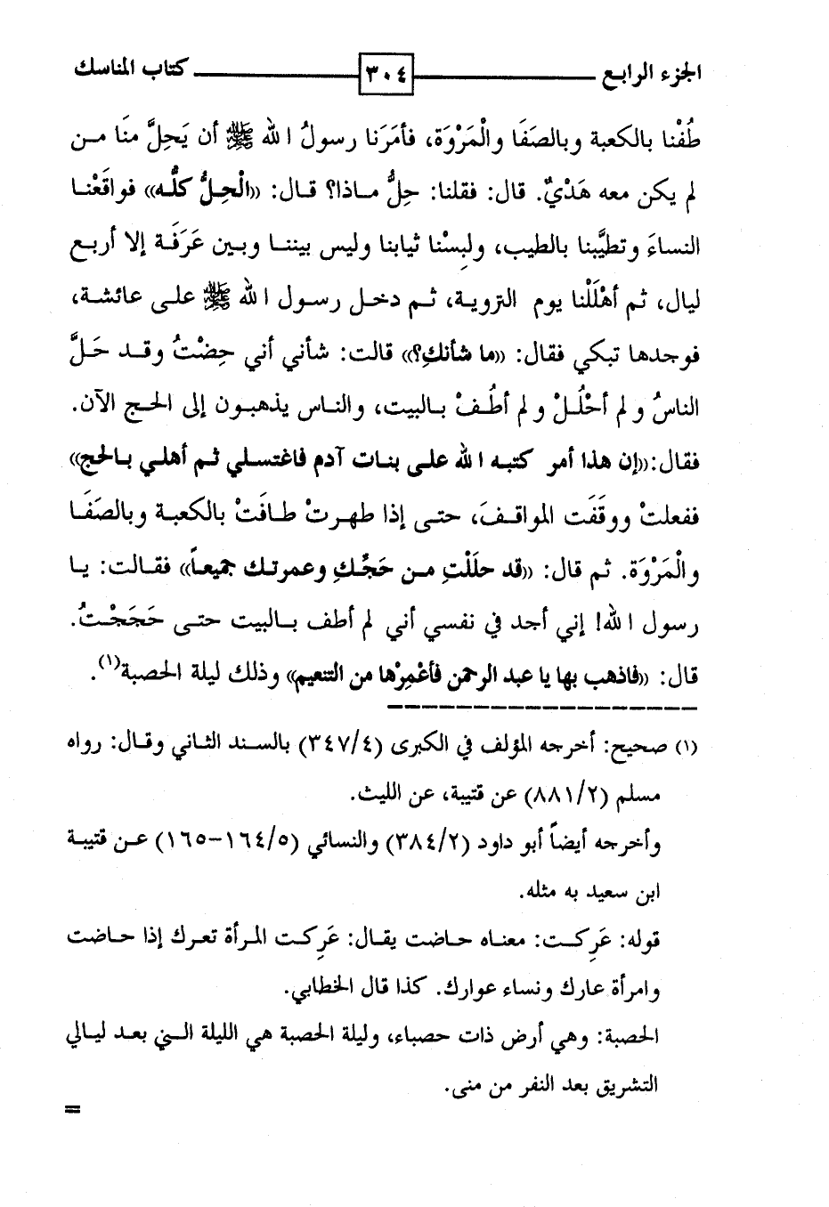 طُفْنا بالكعبة وبالصَفَا والْمَرْوَة ، فأمَرَنا رسولُ الله أن يَحِلَّ منَا من لم يكن معه هَدْيٌ . قال : فقلنا : حِلُّ ماذا ؟ قال : ' الْحِلُّ كلُّه ' فواقَعْنا النساءَ وتطيَّبنا بالطيب ، ولبِسْنا ثيابنا وليس بيننا وبين عَرَفَة إلا أربع ليال ، ثم أهْلَلْنا يوم التروية ، ثم دخل رسول الله على عائشة ، فوجدها تبكي ، فقال : ' ما شأنكِ ؟ ' قالت : شأني أني حِضْتُ وقد حَلَّ الناسُ ولم أحْلُلْ ولم أطُفْ بالبيت ، والناس يذهبون إلى الحج الآن . فقال : ' إن هذا أمر كتبه الله على بنات آدم فاغتسلي ثم أهلي بالحج ' ففعلت ووقَفَت المواقفَ ، حتى إذا طهرتْ طافَتْ بالكعبة وبالصَفَا والْمَرْوَة . ثم قال : ' قد حلَلْتِ من حَجِّكِ وعمرتك جميعاً ' فقالت : يا رسول الله ! إني أجد في نفسي أني لم أطف بالبيت حتى حَجَجْتُ . قال : ' فاذهب بها يا عبد الرحمن فأعْمِرْها من التنعيم ' وذلك ليلة الحصبة ( 1 ) .