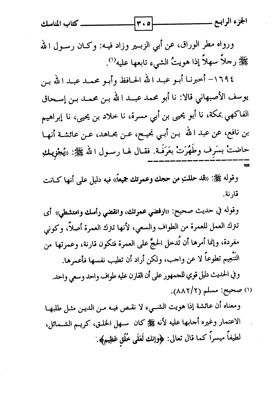 1694 - أخبرنا أبو عبد الله الحافظ وأبو محمد عبد الله بن يوسف الأصبهاني قالا : نا أبو محمد عبد الله بن محمد بن إسحاق الفاكهي بمكة ، نا أبو يحيى بن أبي مسرة ، نا خلاد بن يحيى ، نا إبراهيم بن نافع ، عن عبد الله بن أبي نجيح ، عن مجاهد ، عن عائشة أنها حاضتْ بسَرِف وطَهُرَتْ بعَرَفَة . فقال لها رسول الله : ' يُجْزِيكِ