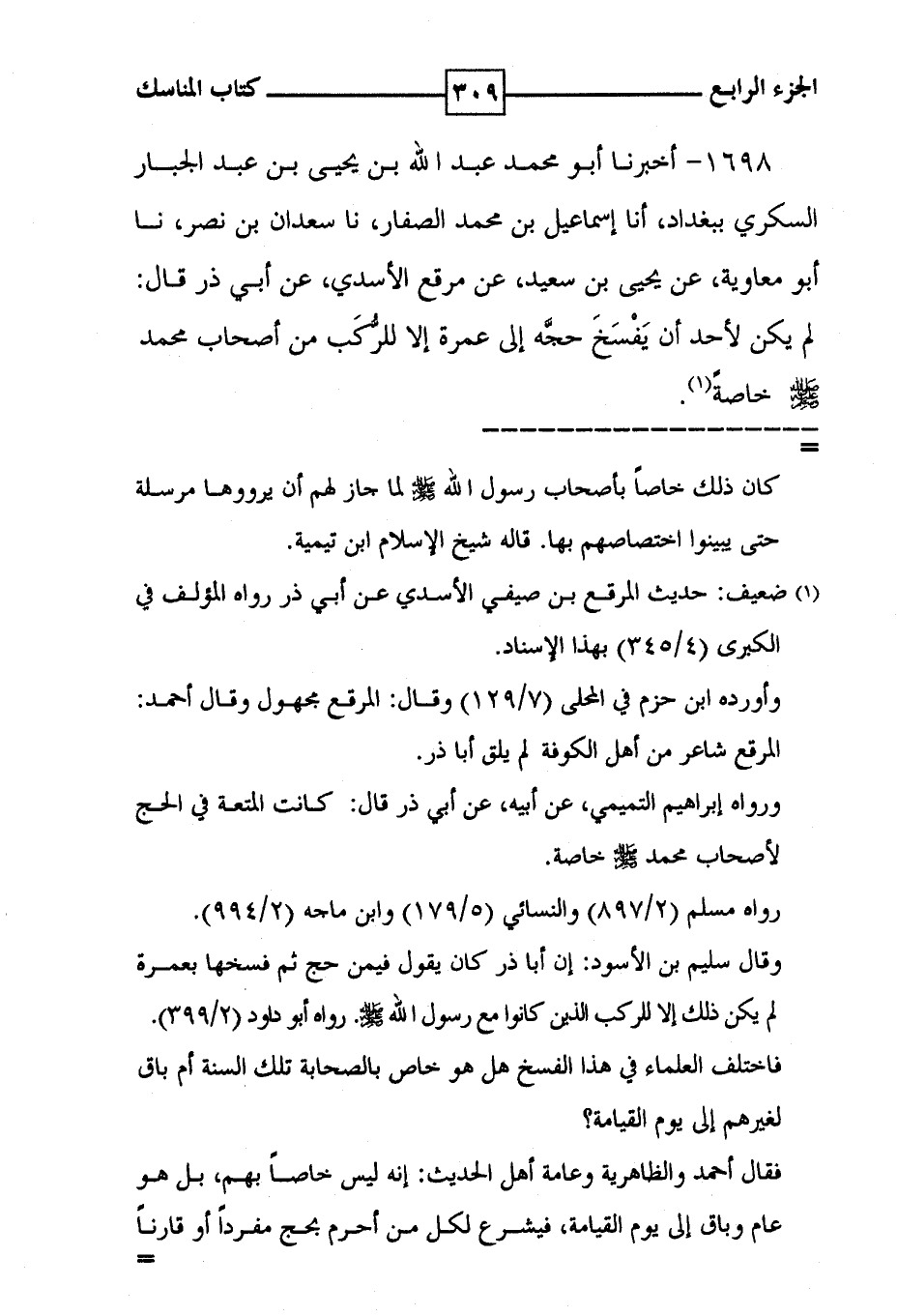 1698 - أخبرنا أبو محمد عبد الله بن يحيى بن عبد الجبار السكري ببغداد ، أنا إسماعيل بن محمد الصفار ، نا سعدان بن نصر ، نا أبو معاوية ، عن يحيى بن سعيد ، عن مرقع الأسدي ، عن أبي ذر قال : لم يكن لأحد أن يَفْسَخَ حجَّه إلى عمرة إلا للرُّكَب من أصحاب محمد خاصةٌ ( 1 ) .