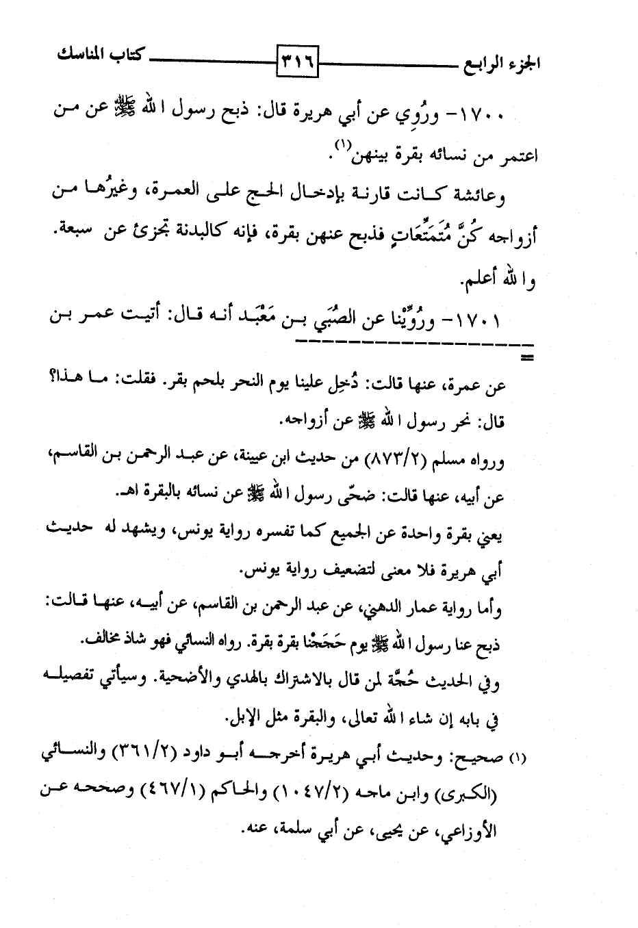 1700 - ورُوِي عن أبي هريرة قال : ذبح رسول الله عن من اعتمر من نسائه بقوة بينهن ( 1 ) . وعائشة كانت قارنة بإدخال الحج على العمرة ، وغيرُها من أزواجه كُنَّ مُتَمَتِّعَاتٍ فذبح عنهن بقرة ، فإنه كالبدنة تجزئ عن سبعة . والله أعلم .