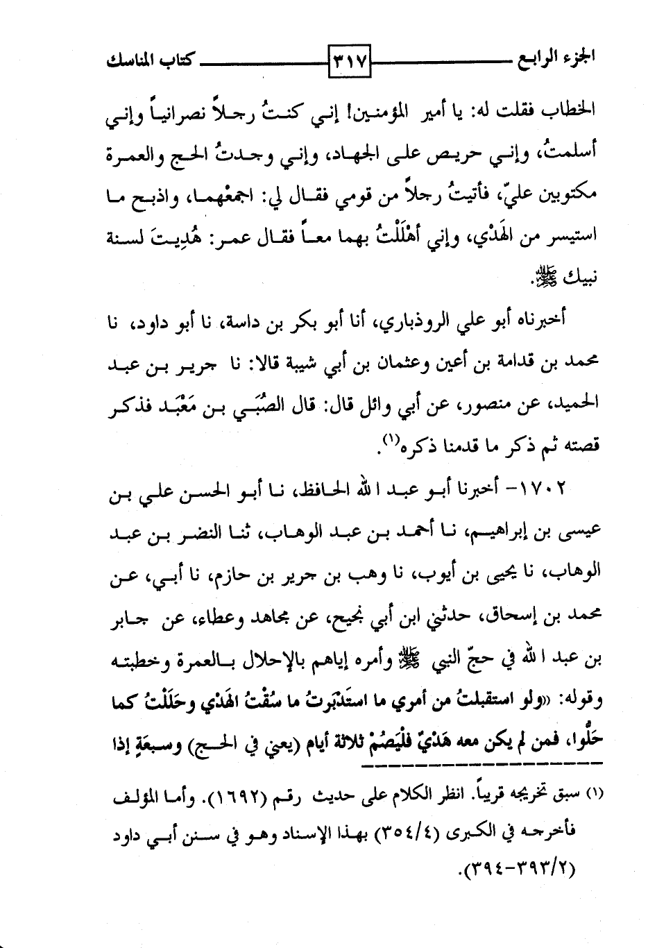 الخطاب فقلت له : يا أمير المؤمنين ! إني كنتُ رجلاً نصرانياً وإني أسلمتُ ، وإني حريص على الجهاد ، وإني وجدتُ الحج والعمرة مكتوبين عليّ ، فأتيتُ رجلاً من قومي فقال لي : اجمعْهما ، واذبح ما استيسر من الهَدْي ، وإني أهْلَلْتُ بهما معاً فقال عمر : هُدِيتَ لسنة نبيك . أخبرناه أبو علي الروذباري ، أنا أبو بكر بن داسة ، نا أبو داود ، نا محمد بن قدامة بن أعين وعثمان بن أبي شيبة قالا : نا جرير بن عبد الحميد ، عن منصور ، عن أبي وائل قال : قال الصُبَي بن مَعْبَد فذكر قصته ثم ذكر ما قدمنا ذكره ( 1 ) .