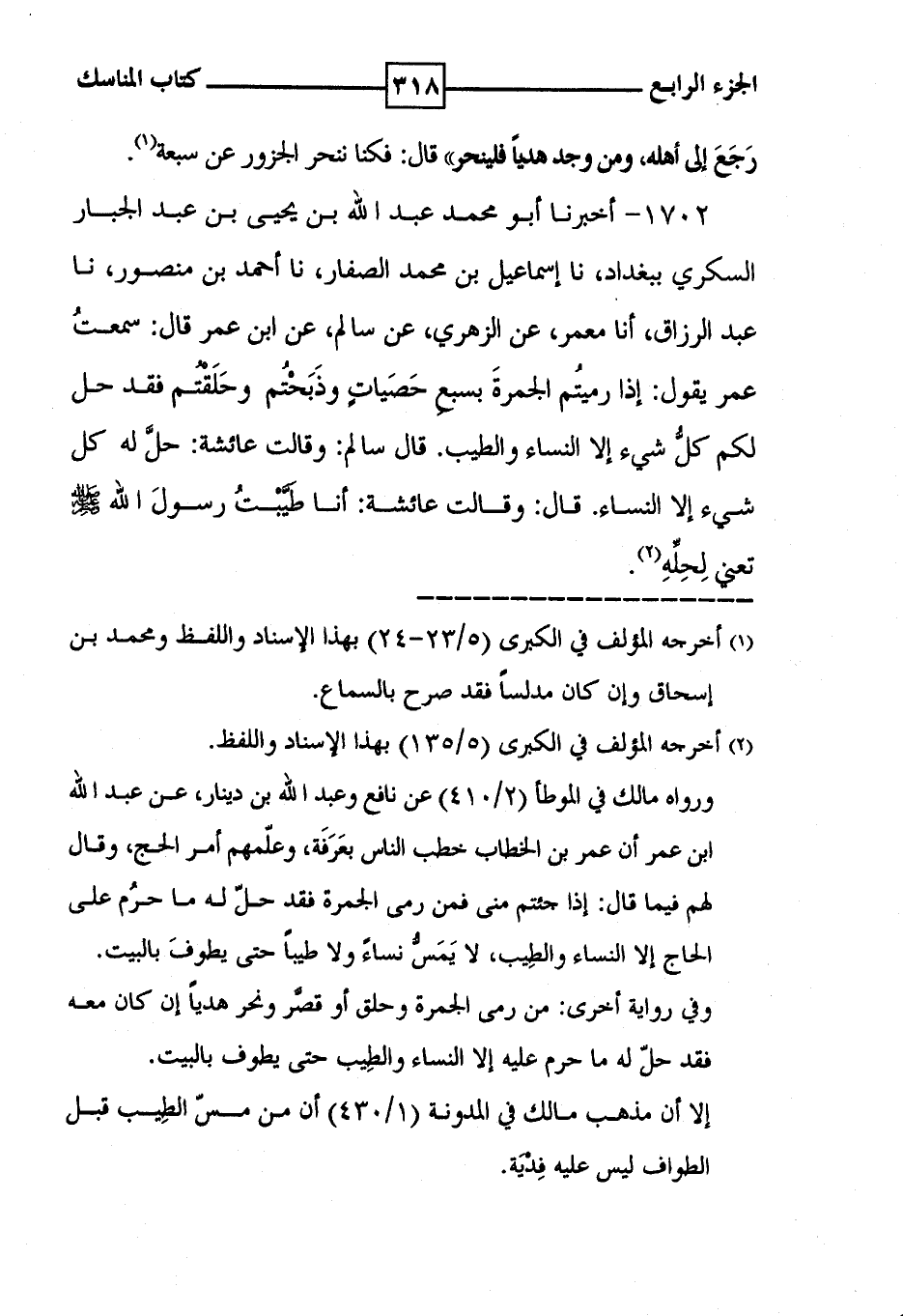 1702 - أخبرنا أبو محمد عبد الله بن يحيى بن عبد الجبار السكري ببغداد ، نا إسماعيل بن محمد الصفار ، نا أحمد بن منصور ، نا عبد الرزاق ، أنا معمر ، عن الزهري ، عن سالم ، عن ابن عمر قال : سمعتُ عمر يقول : إذا رميتُم الجمرةَ بسبعِ حَصَياتٍ وذَبَحْتُم وحَلَقْتُم فقد حل لكم كلُّ شيء إلا النساء والطيب . قال سالم : وقالت عائشة : حلَّ له كل شيء إلا النساء . قال : وقالت عائشة : أنا طَيَّبْتُ رسولَ الله تعني لِحِلِّهِ ( 2 ) .