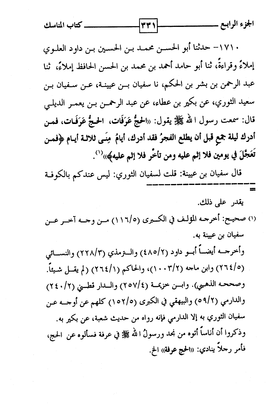 1710 - حدثنا أبو الحسن محمد بن الحسين بن داود العلوي إملاءً وقراءةً ، ثنا أبو حامد أحمد بن محمد بن الحسن الحافظ إملاءً ، ثنا عبد الرحمن بن بشر بن الحكم ، نا سفيان بن عيينة ، عن سفيان بن سعيد الثوري ، عن بكير بن عطاء ، عن عبد الرحمن بن يعمر الديلي قال : سمعت رسول الله يقول : ' الحجُّ عَرَفَات ، الحجُّ عَرَفَات ، فمن أدرك ليلة جمعٍ قبل أن يطلع الفجرُ فقد أدرك ، أيامُ مِنَى ثلاثة أيام ! ( فمن تعجل في يومين فلا إثم عليه ومن تأخر فلا إثم عليه ) ! ( 1 ) . قال سفيان بن عيينة : قلت لسفيان الثوري : ليس عندكم بالكوفة