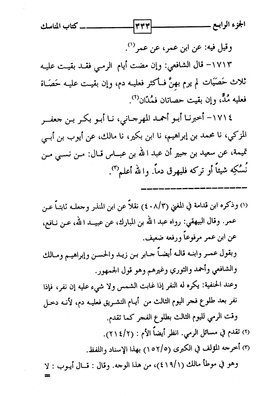 1714 - أخبرنا أبو أحمد المهرجاني ، نا أبو بكر بن جعفر المزكي ، نا محمد بن إبراهيم ، نا ابن بكير ، نا مالك ، عن أيوب بن أبي تميمة ، عن سعيد بن جبير أن عبد الله بن عباس قال : من نسي من نُسُكِه شيئاً أو تركه فليهرق دماً . والله أعلم ( 3 ) .