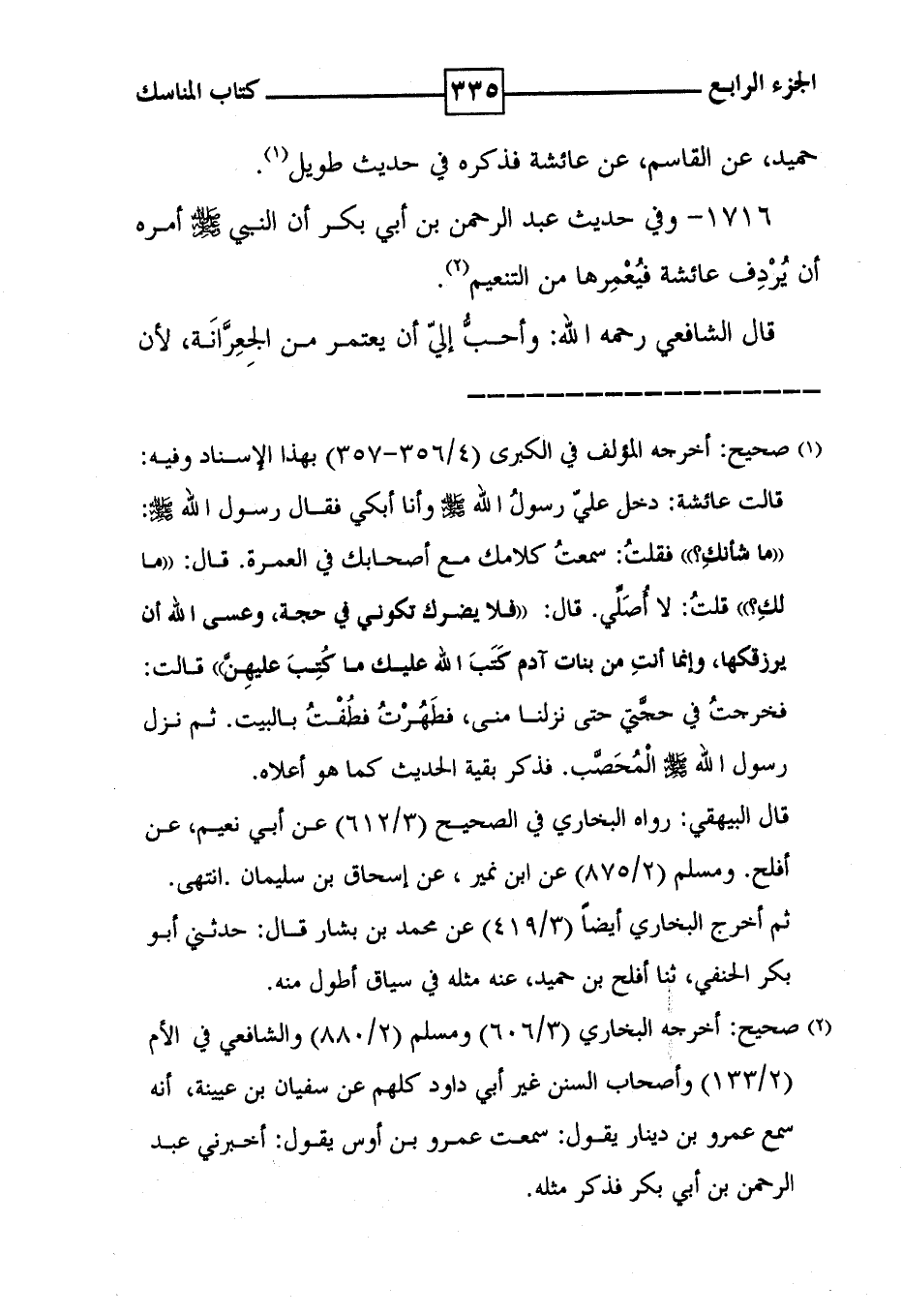 1716 - وفي حديث عبد الرحمن بن أبي بكر أن النبي أمره أن يُرْدِف عائشة فيُعْمِرها من التنعيم ( 2 ) . قال الشافعي رحمه الله : وأحبُّ إليّ أن يعتمر من الجِعِرَّانَة ، لأن