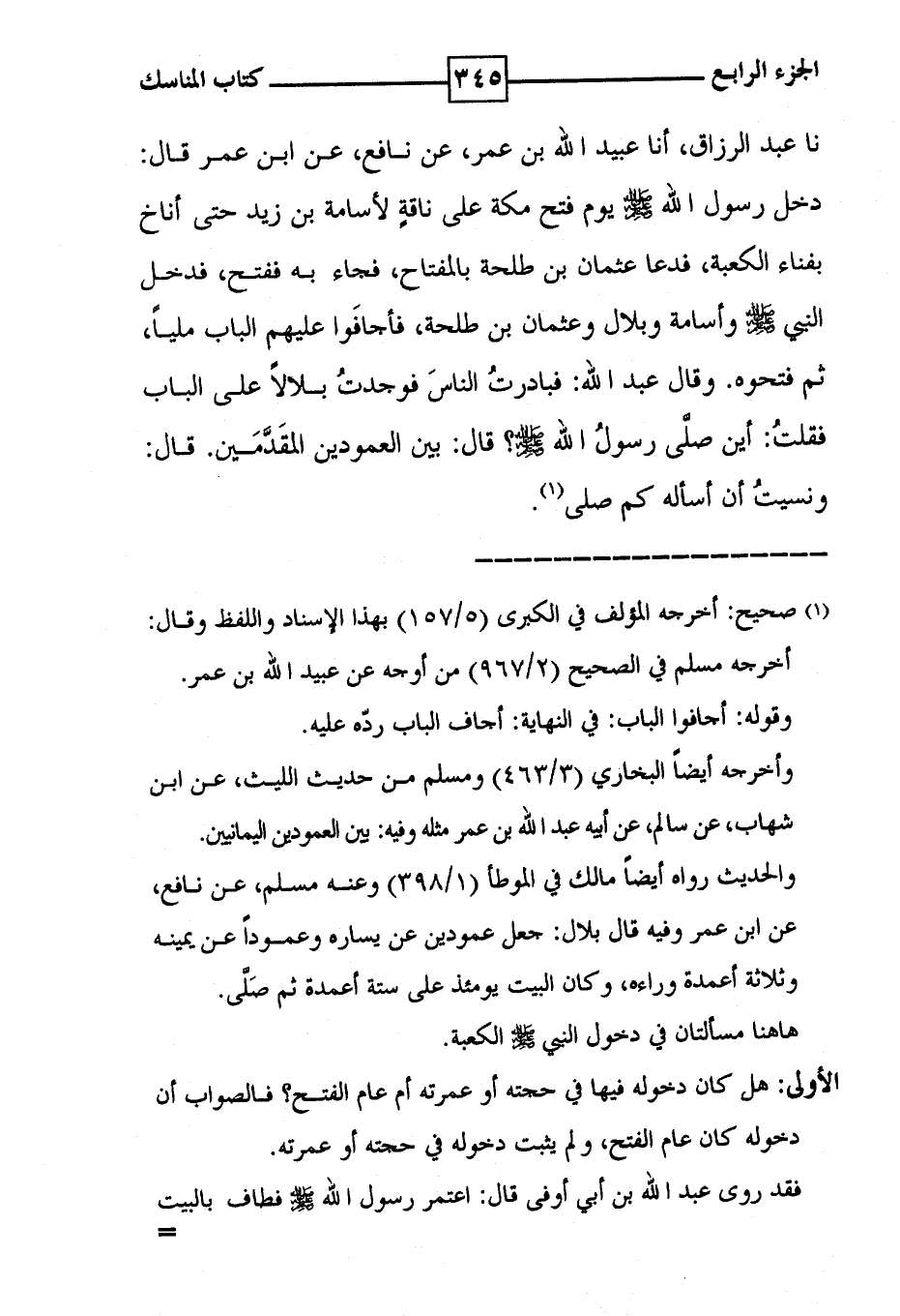 نا عبد الرزاق ، أنا عبيد الله بن عمر ، عن نافع ، عن ابن عمر قال : دخل رسول الله يوم فتح مكة على ناقةٍ لأسامة بن زيد حتى أناخ بفناء الكعبة ، فدعا عثمان بن طلحة بالمفتاح ، فجاء به ففتح ، فدخل النبي وأسامة وبلال وعثمان بن طلحة ، فأجافَوا عليهم الباب ملياً ، ثم فتحوه . وقال عبد الله : فبادرتُ الناسَ فوجدتُ بلالاً على الباب فقلتُ : أين صلّى رسولُ الله ؟ قال : بين العمودين المقَدَّمَين . قال : ونسيتُ أن أسأله كم صلى ( 1 ) .