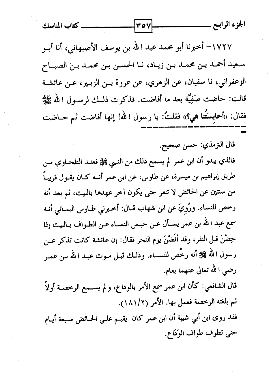 1727 - أخبرنا أبو محمد عبد الله بن يوسف الأصبهاني ، أنا أبو سعيد أحمد بن محمد بن زياد ، نا الحسن بن محمد بن الصباح الزعفراني ، نا سفيان ، عن الزهري ، عن عروة بن الزبير ، عن عائشة قالت : حاضت صَفِيَّة بعد ما أفاضت . فذكرت ذلك لرسول الله فقال : ' أحابِسَتُنا هي ؟ ' فقلتُ : يا رسول الله ! إنها أفاضت ثم حاضت