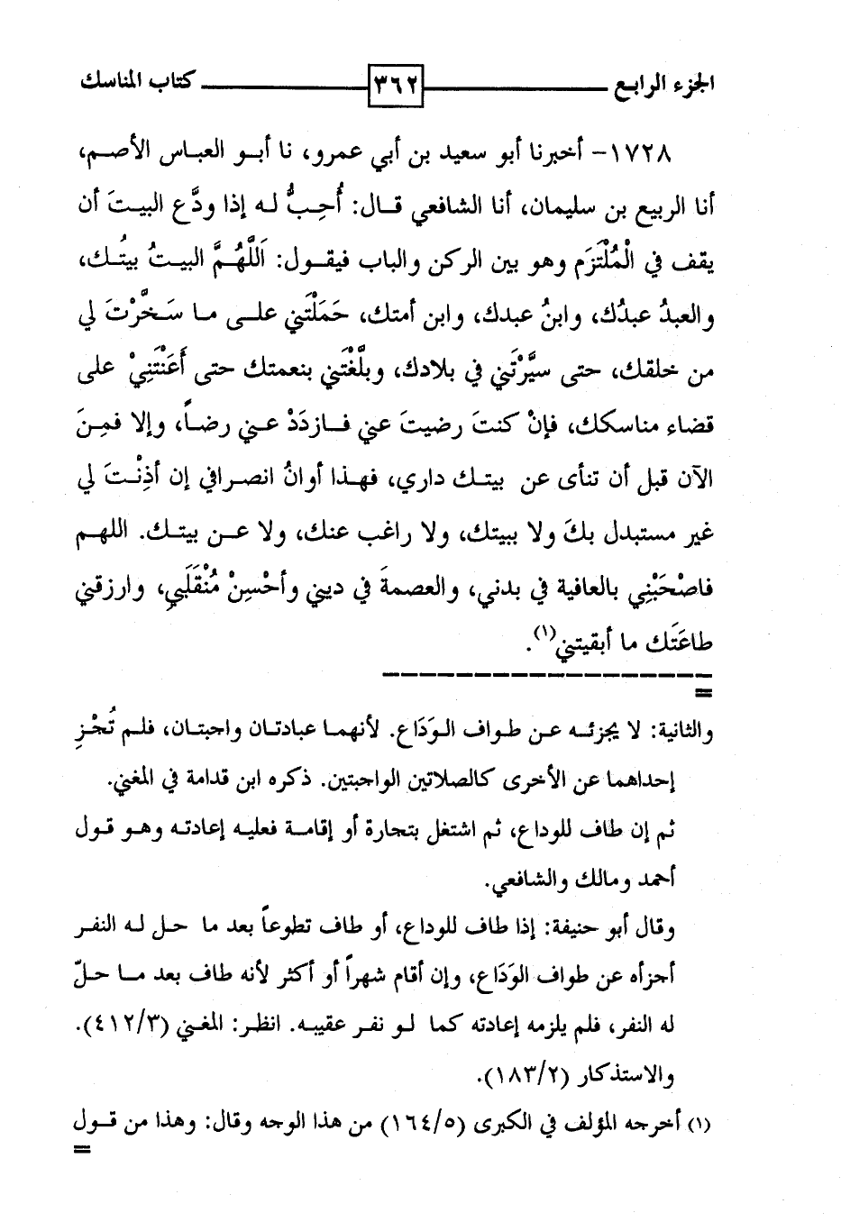 1728 - أخبرنا أبو سعيد بن أبي عمرو ، نا أبو العباس الأصم ، أنا الربيع بن سليمان ، أنا الشافعي قال : أُحِبُّ له إذا ودَّع البيتَ أن يقف في الْمُلْتَزَم وهو بين الركن والباب فيقول : اللَّهُمَّ البيتُ بيتُك ، والعبدُ عبدُك ، وابنُ عبدك ، وابن أمتك ، حَمَلْتَني على ما سَخَّرْت لي من خلقك ، حتى سيَّرْتَني في بلادك ، وبلَّغَتَني بنعمتك حتى أَعَنْتَنِيْ على قضاء مناسكك ، فإنْ كنتَ رضيتَ عني فازدَدْ عني رضاً ، وإلا فمِنَ الآن قبل أن تنأى عن بيتك داري ، فهذا أوانُ انصرافي إن أذِنْتَ لي غير مستبدل بكَ ولا ببيتك ، ولا راغب عنك ، ولا عن بيتك . اللهم فاصْحَبْنِي بالعافية في بدني ، والعصمةَ في ديني وأحْسِنْ مُنْقَلَبِي ، وارزقني طاعَتَك ما أبقيتني ( 1 ) .