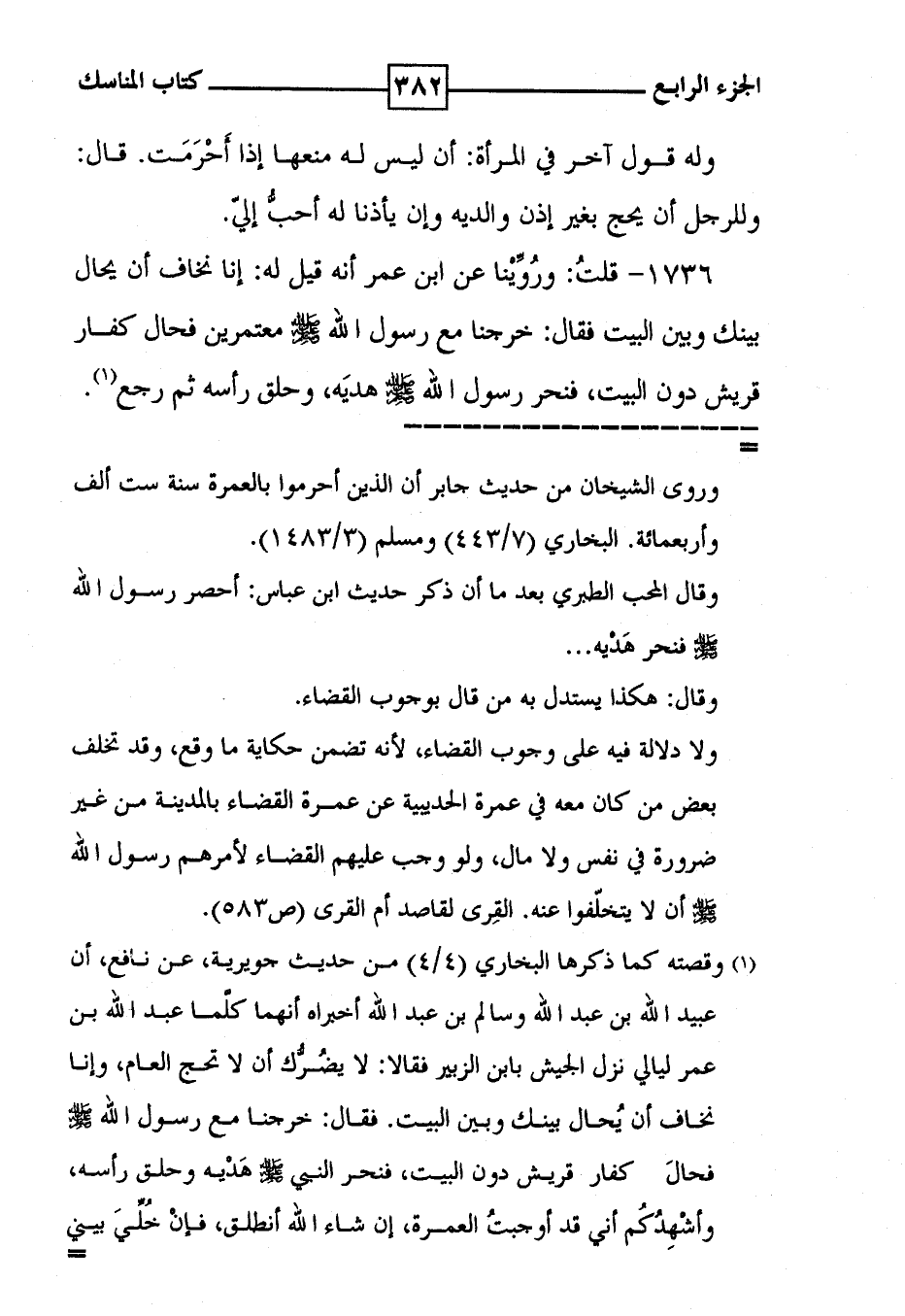 1736 - قلتُ : ورُوِّيْنا عن ابن عمر أنه قيل له : إنا نخاف أن يحال بينك وبين البيت فقال : خرجنا مع رسول الله معتمرين فحال كفار قريش دون البيت ، فنحر رسول الله هدَيه ، وحلق رأسه ثم رجع ( 1 ) .