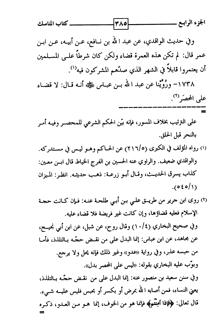 1738 - ورُوِّيْنا عن عبد الله بن عباس رضي الله عنه أنه قال : لا قضاء على المحصَر ( 2 ) .