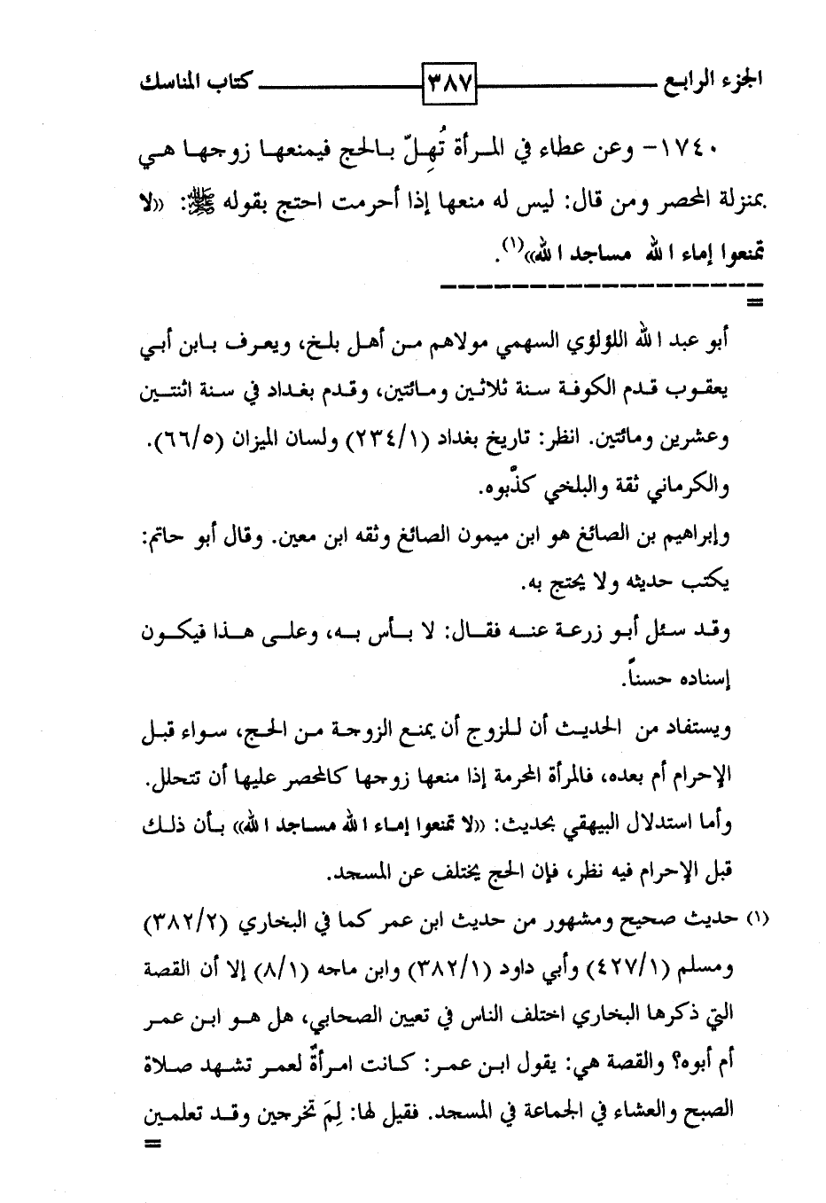 1740 - وعن عطاء في المرأة تُهِلّ بالحج فيمنعها زوجها هي بمنزلة المحصر ومن قال : ليس له منعها إذا أحرمت احتج بقوله : ' لا تمنعوا إماء الله مساجد الله ' ( 1 ) .