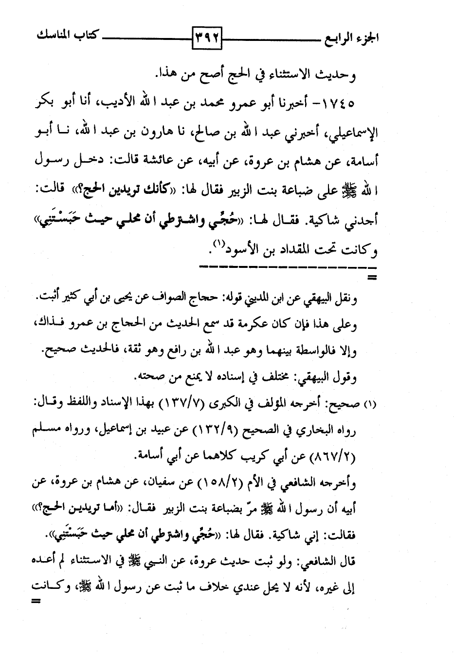 1745 - أخبرنا أبو عمرو محمد بن عبد الله الأديب ، أنا أبو بكر الإسماعيلي ، أخبرني عبد الله بن صالح ، نا هارون بن عبد الله ، نا أبو أسامة ، عن هشام بن عروة ، عن أبيه ، عن عائشة قالت : دخل رسول الله على ضباعة بنت الزبير فقال لها : ' كأنك تريدين الحج ؟ ' قالت : أجدني شاكية . فقال لها : ' حُجِّي واشترطي أن محلي حيث حَبَسْتَنِي ' وكانت تحت المقداد بن الأسود ( 1 ) .