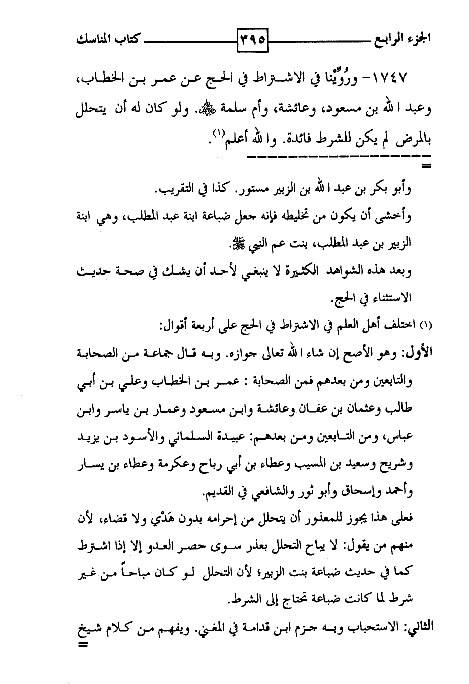 1747 - ورُوِّيْنا في الاشتراط في الحج عن عمر بن الخطاب ، وعبد الله بن مسعود ، وعائشة ، وأم سلمة رضي الله عنها ، ولو كان له أن يتحلل بالمرض لم يكن للشرط فائدة . والله أعلم ( 1 ) .