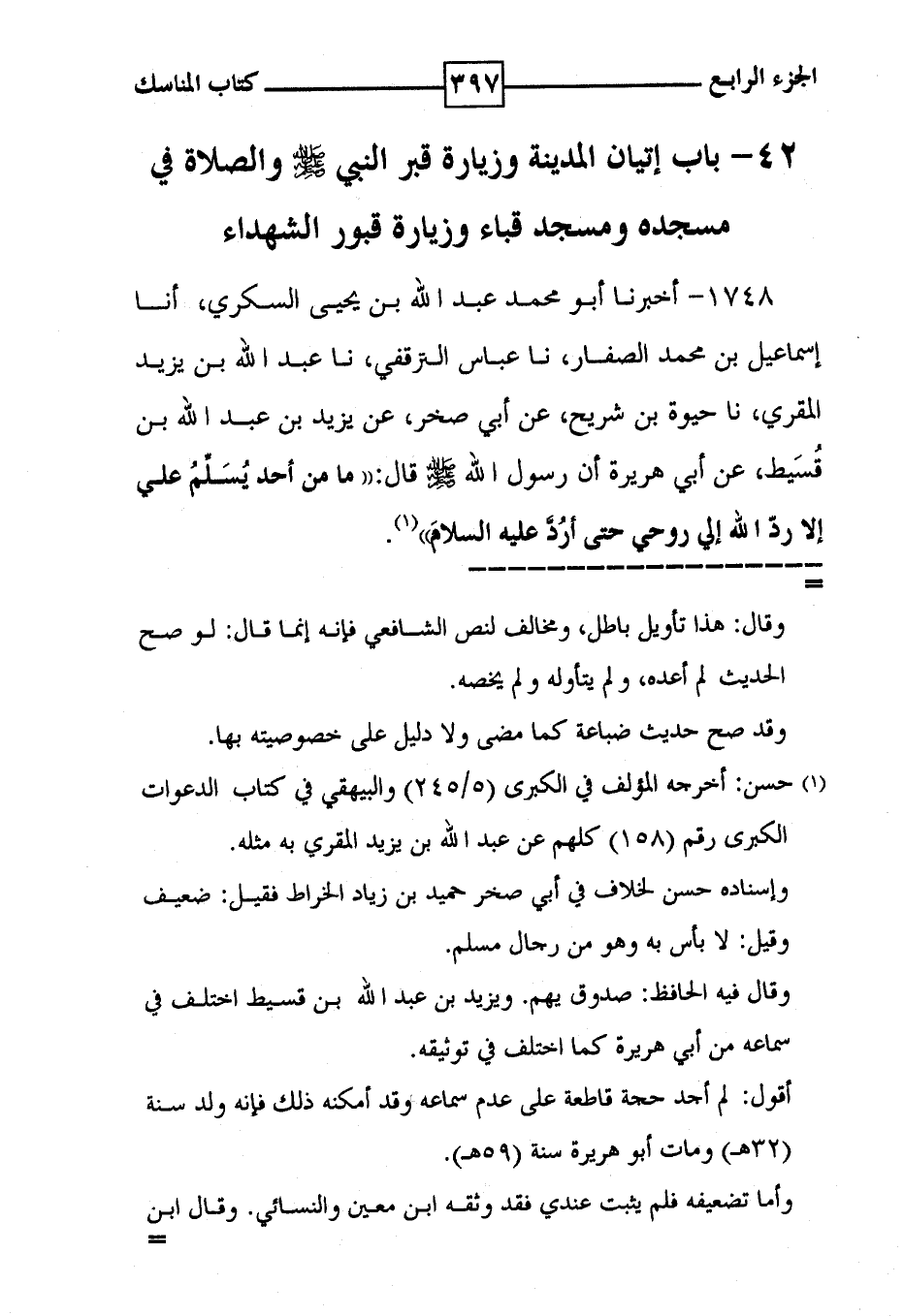 42 - باب إتيان المدينة وزيارة قبر النبي والصلاة في مسجده ومسجد قباء وزيارة قبور الشهداء
