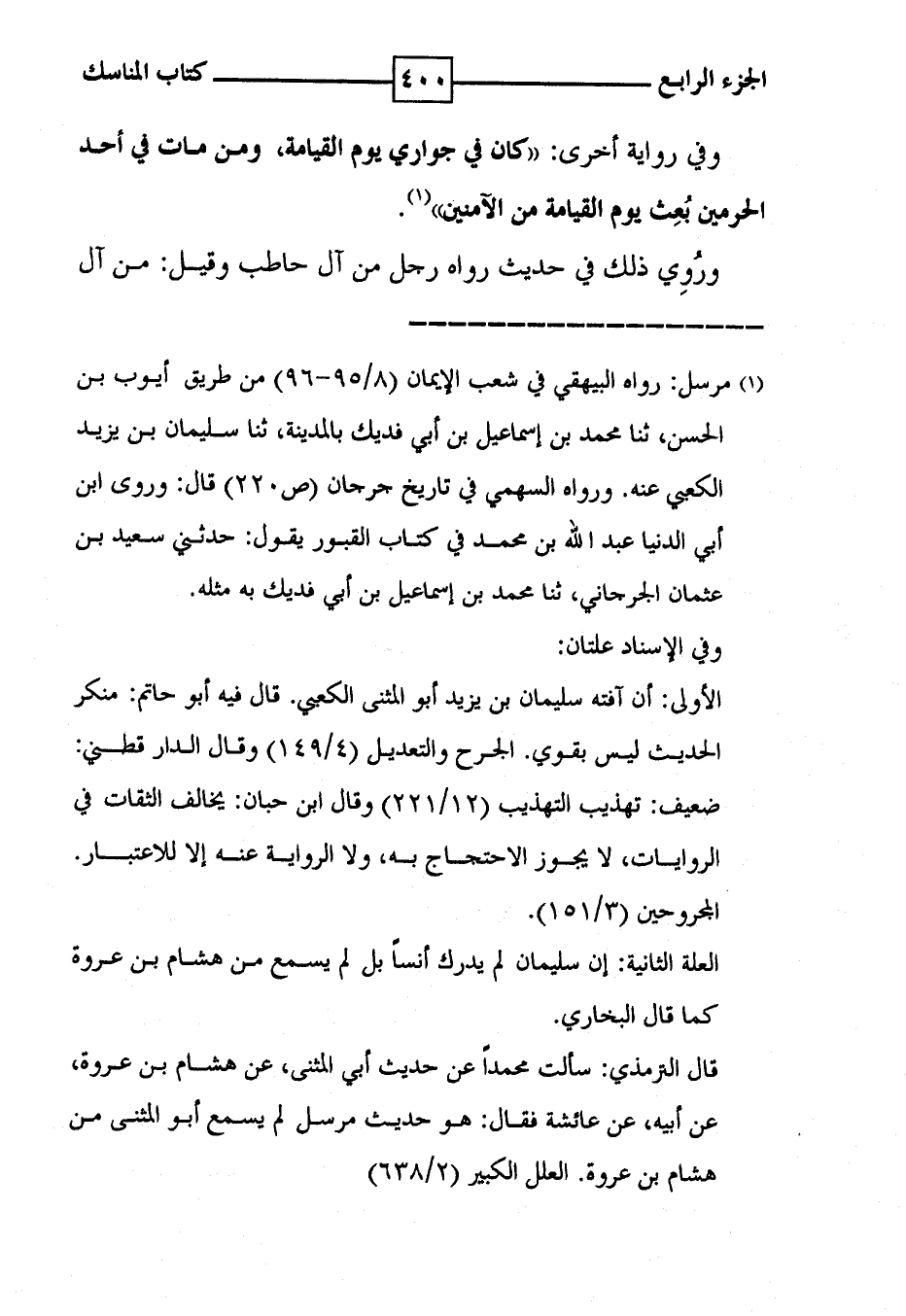 وفي رواية أخرى : ' كان في جواري يوم القيامة ، ومن مات في أحد الحرمين بُعِث يوم القيامة من الآمنين ' ( 1 ) . ورُوِي ذلك في حديث رواه رجل من آل حاطب وقيل : من آل