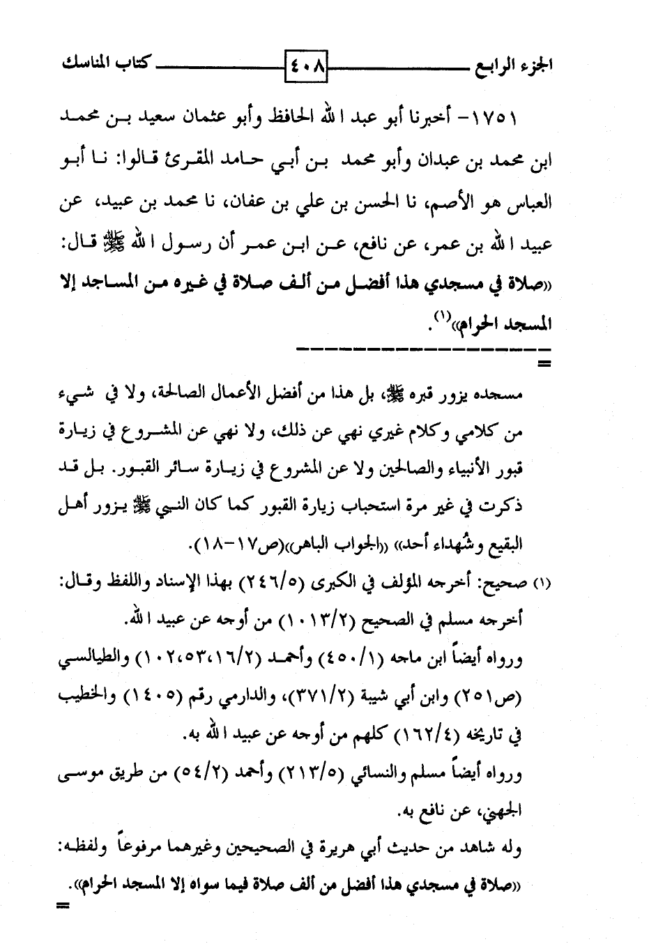 1751 - أخبرنا أبو عبد الله الحافظ وأبو عثمان سعيد بن محمد ابن محمد بن عبدان وأبو محمد بن أبي حامد المقرئ قالوا : نا أبو العباس هو الأصم ، نا الحسن بن علي بن عفان ، نا محمد بن عبيد ، عن عبيد الله بن عمر ، عن نافع ، عن ابن عمر أن رسول الله قال : ' صلاة في مسجدي هذا أفضل من ألف صلاة في غيره من المساجد إلا المسجد الحرام ' ( 1 ) .