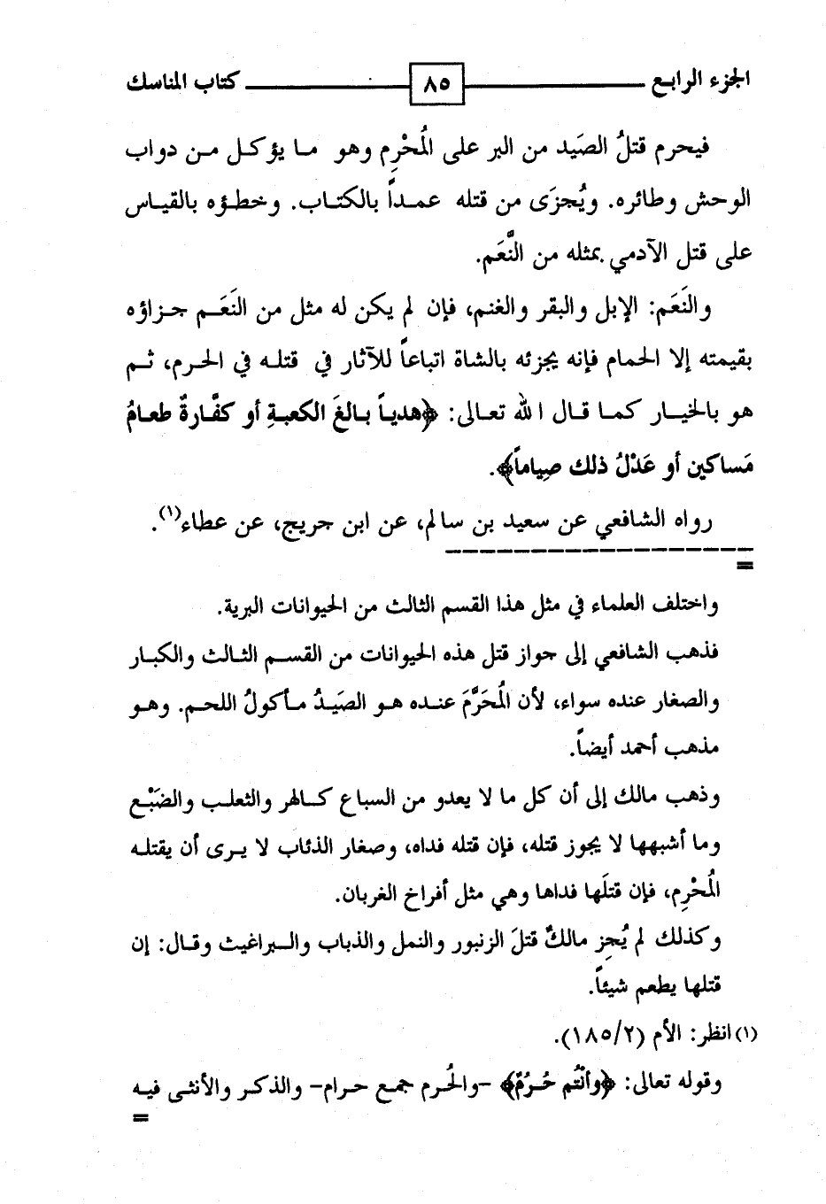 فيحرم قتلُ الصَيد من البر على المُحْرِم وهو ما يؤكل من دواب الوحش وطائره . ويُجزَى من قتله عمداً بالكتاب . وخطؤه بالقياس على قتل الآدمي بمثله من النَّعَم . والنَعَم : الإبل والبقر والغنم ، فإن لم يكن له مثل من النَعَم جزاؤه بقيمته إلا الحمام فإنه يجزئه بالشاة اتباعاً للآثار في قتله في الحرم ، ثم هو بالخيار كما قال الله تعالى : ! ( هديا بالغ الكعبة أو كفارة طعام مساكين أو عدل ذلك صياما ) ! . رواه الشافعي عن سعيد بن سالم ، عن ابن جريج ، عن عطاء ( 1 ) .