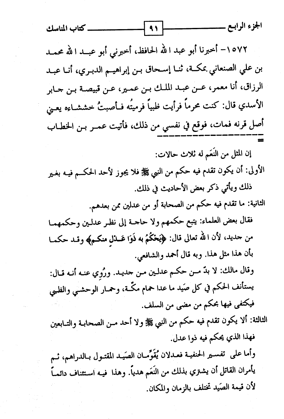 1572 - أخبرنا أبو عبد الله الحافظ ، أخبرني أبو عبد الله محمد بن علي الصنعاني بمكة ، ثنا إسحاق بن إبراهيم الدبري ، أنا عبد الرزاق ، أنا معمر ، عن عبد الملك بن عمير ، عن قبيصة بن جابر الأسدي قال : كنت محرماً فرأيت ظبياً فرميتُه فأصبتُ خششاءه يعني أصل قرنه فمات ، فوقع في نفسي من ذلك ، فأتيت عمر بن الخطاب